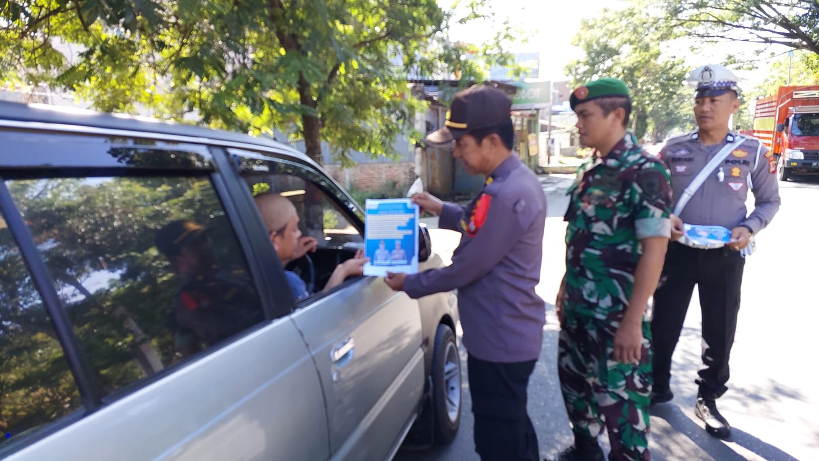 Selain membagikan brosur, petugas juga memberikan imbauan keamanan, keselamatan, ketertiban dan kelancaran lalu lintas (Kamseltibcarlantas) agar tetap tertib berlalu lintas saat berkendara.