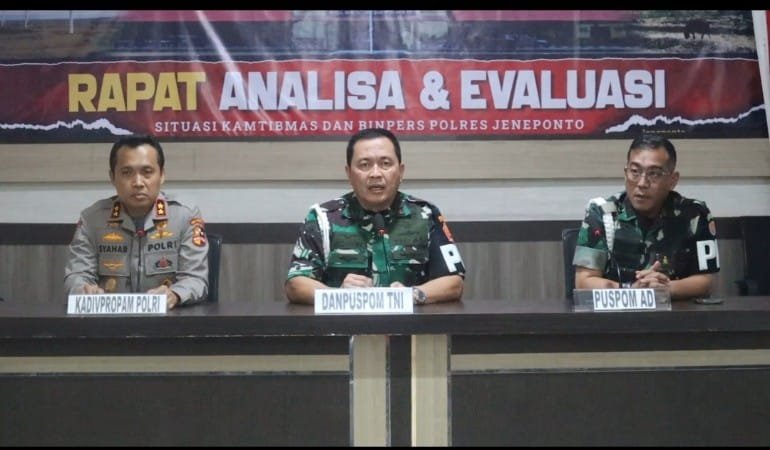 Cybernews86 — Konferensi Pers TIM Gabungan yang terdiri dari Div Propam Polri, PUS POM TNI, PUS POM TNI AD, PUS POM TNI AU, PUS POM TNI AL yang di laksanakan di Mako Polres Jeneponto. Sabtu, 29 April 2023.