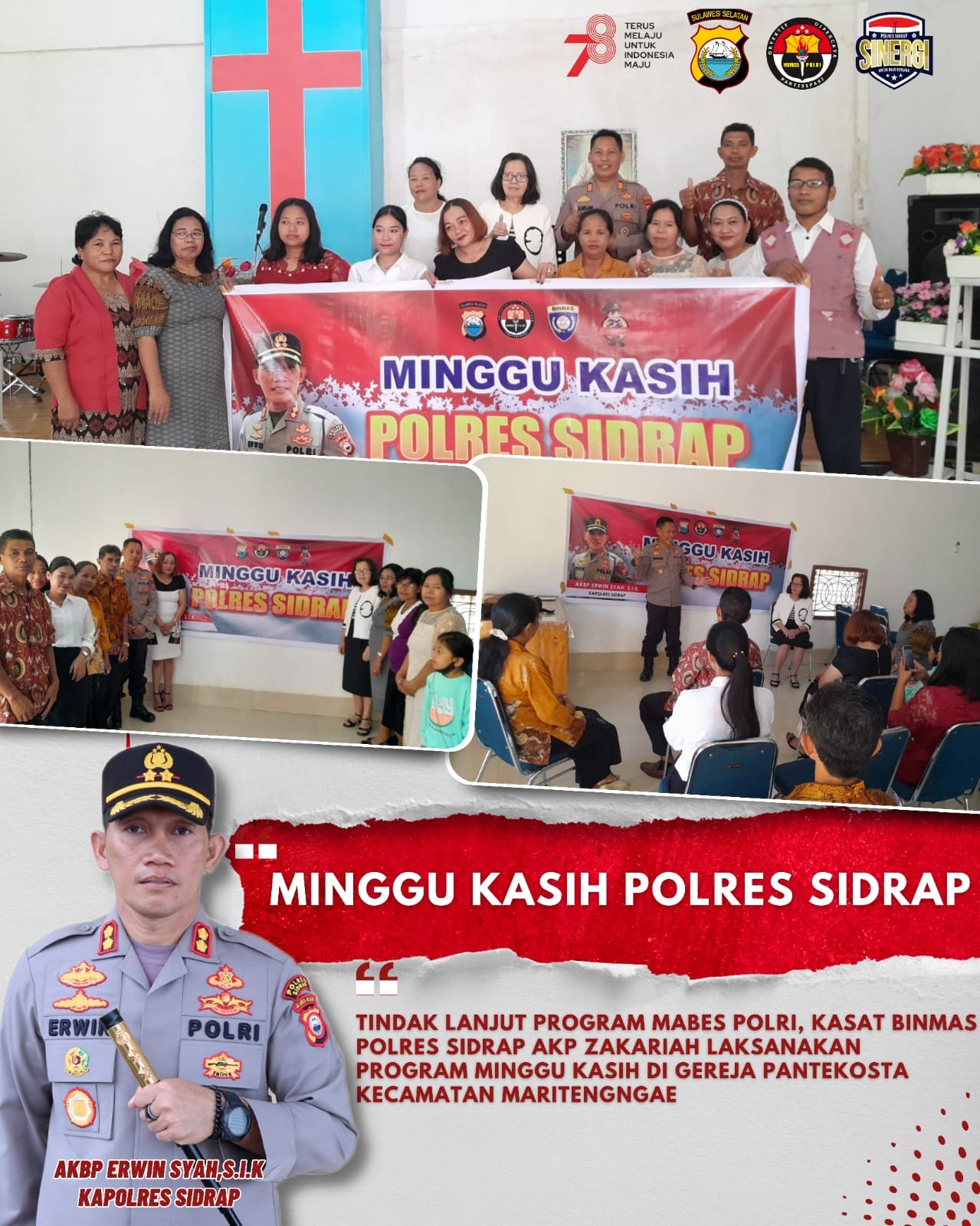 SIDRAP – Kapolres Sidrap AKBP Erwin Syah,SIK yang di wakili oleh Kasat Binmas AKP Zakariah, SH melaksanakan Minggu Kasih bersama Jemaat di Gereja Pantekosta Kel. Lautang Benteng, Kec. Maritengngae, Kab. Sidrap. Minggu (20/8/2023).