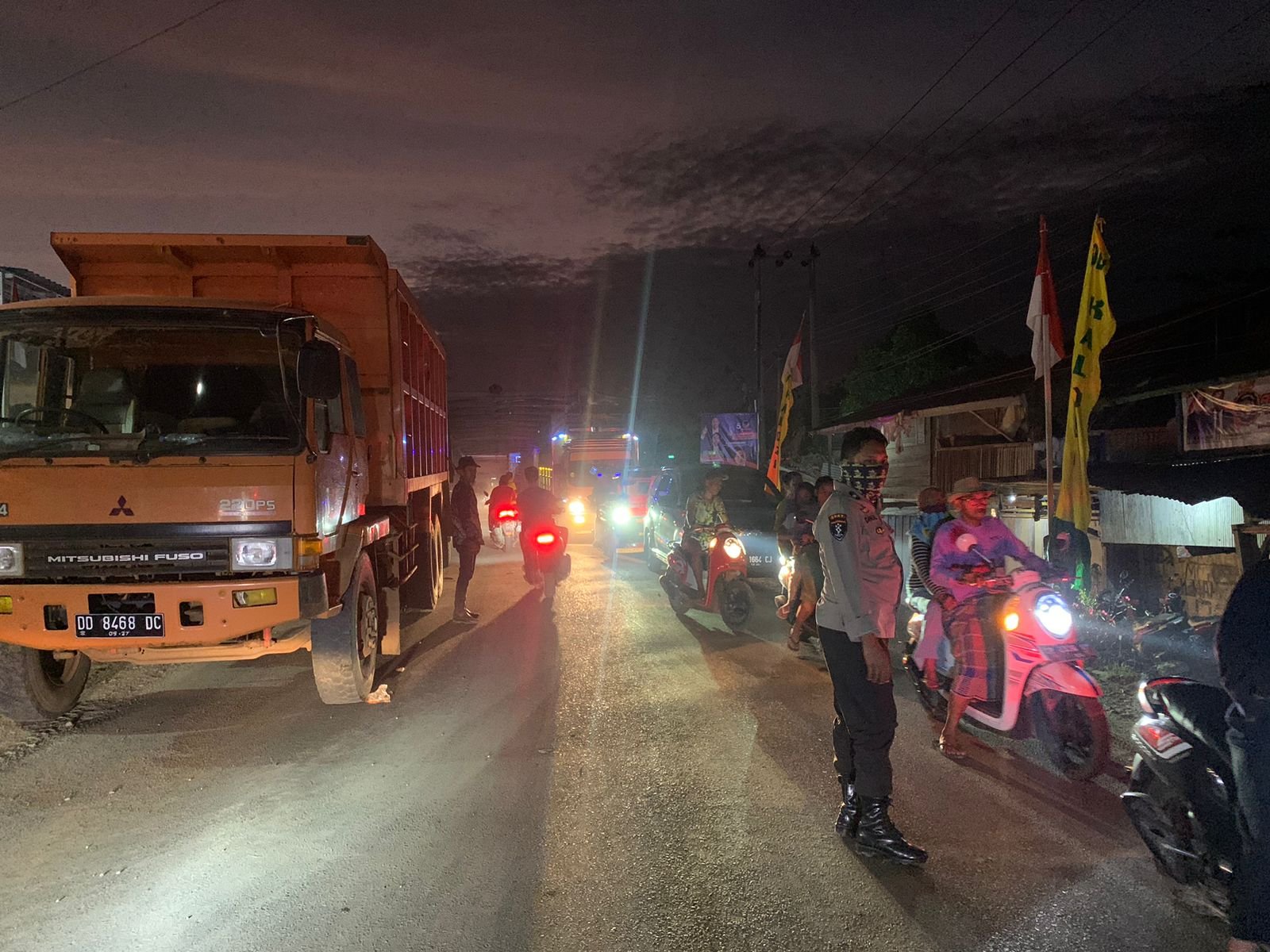 SIDRAP – Kapolres Sidrap AKBP Erwin Syah,SIK turunkan Personel Polres Sidrap yang di pimpin langsung oleh Kapolsek Dua Pitue IPTU Bachri untuk melakukan pengaturan arus lalu lintas di sepanjang jalan Poros Sidrap – Wajo, Tanru Tedong, Kec. Dua Pitue. Senin malam (28/8/2023).
