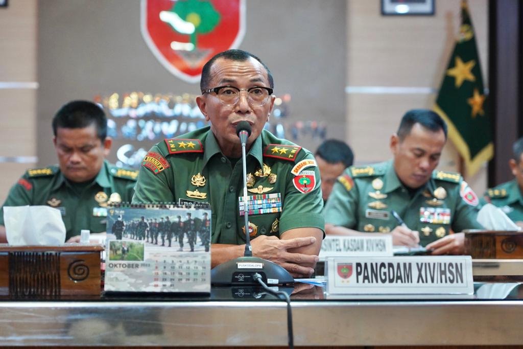 Makassar โ€“ Pangdam XIV/Hasanuddin Mayjen TNI Dr. Totok Imam Santoso, S.I.P., S.Sos., M.Tr (Han)., menggelar Video Conference dengan Satuan Penugasan jajaran wilayah Kodam XIV/Hasanuddin, bertempat di Ruang Vicon Puskodalops Makodam, Kota Makassar. Senin (11/09/2023).