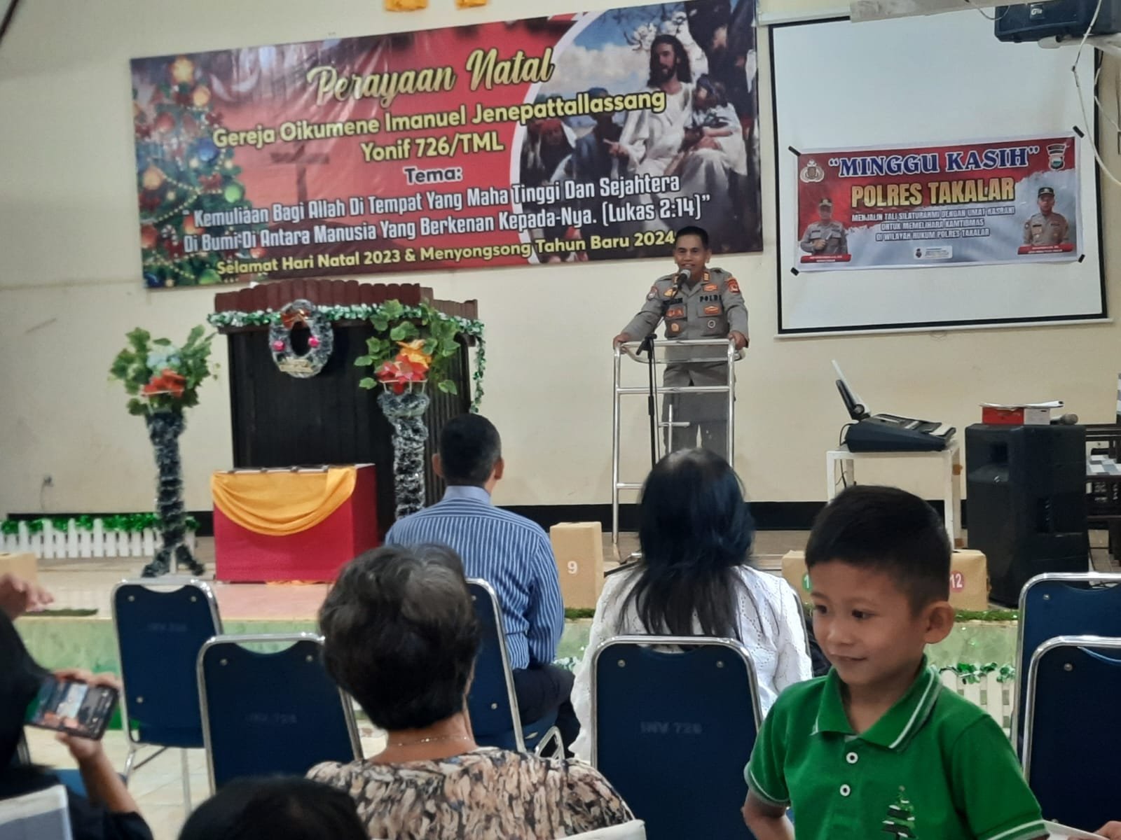 JENEPONTO- Kasat Binmas AKP Supriadi, S.Sos., M.M mewakili Kapolres Takalar Terima Aspirasi Warga dalam kegiatan Minggu Kasih di Gereja Oikumene Imanuel Jenepattallassang, Yonif 727 Tamalatea, Kabupaten Jeneponto. Minggu, (24/12/2023).