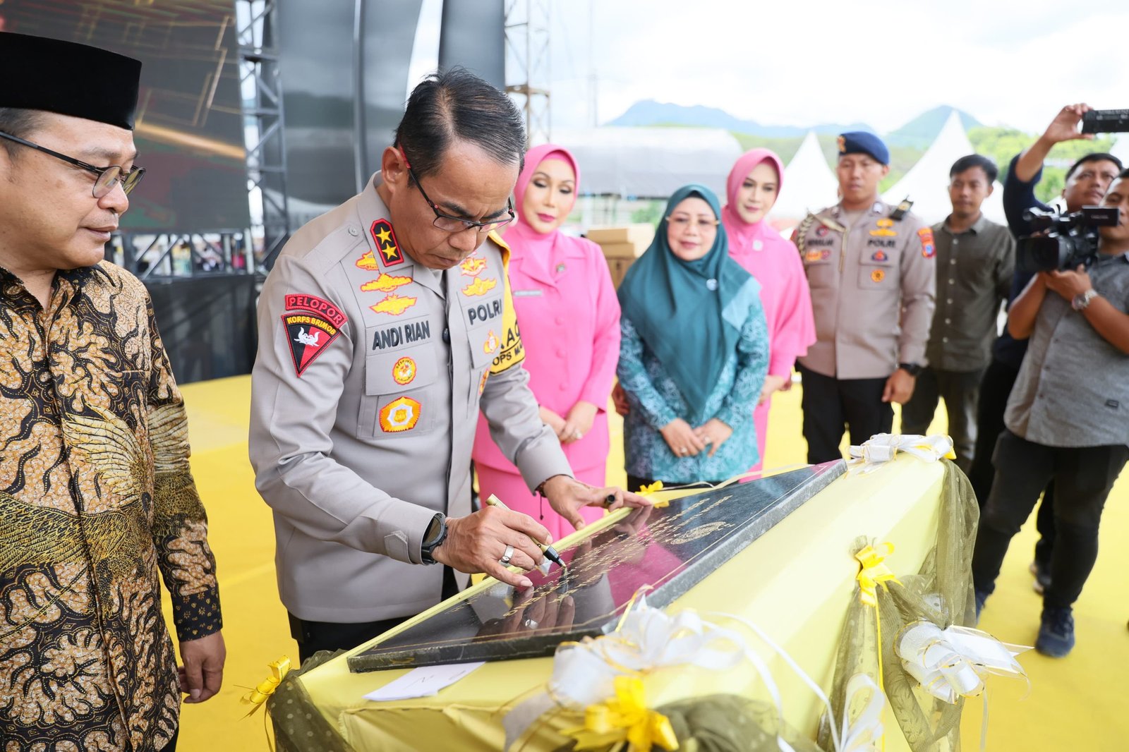 Irjen Pol Andi Rian R Djajadi, S.I.K., M.H. didampingi Ketua Bhayangkari Daerah Sulawesi Selatan Ny Dewwy Andi Rian serta Pejabat Utama Polda Sulsel disambut Oleh Kapolres Soppeng AKBP Dr. (C) H. Muhammad Yusuf Usman S.H.,S.I.K.,M.T dan Ketua Bhayangkari Cabang Soppeng Ny Denny Yusuf.