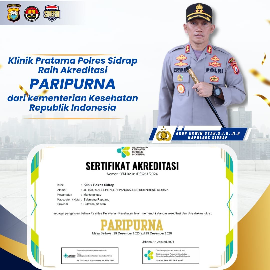 SIDRAP – Dibawah kepemimpinan Kapolres Sidrap AKBP Erwin Syah, S.I.K.M.H, Klinik Pratama Polres Sidrap yang berada di Jalan Bau Maseppe No 01 Kelurahan Pangkajene, Kecematan Maritengngae, Kabupaten Sidrap meraih Akreditasi Paripurna dari Kementerian Kesehatan Republik Indonesia.