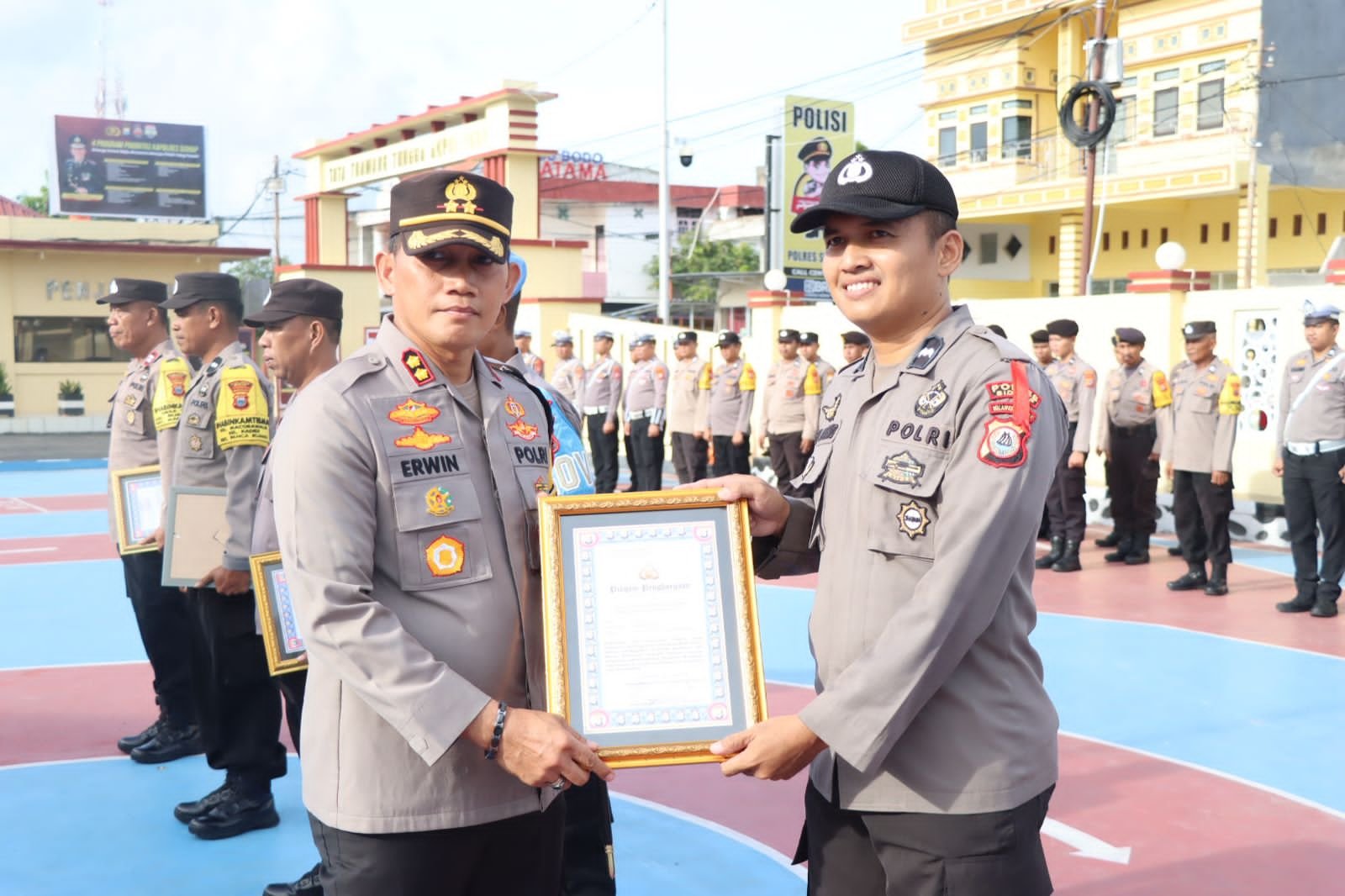 Pada pelaksanaan Apel pagi tersebut, Kapolres Sidrap AKBP Erwin Syah,SIK.,MH juga memberikan penghargaan atau reward kepada Personel Polres Sidrap yang berprestasi sebagai bentuk apresiasi kepada personel atas kinerjanya.
