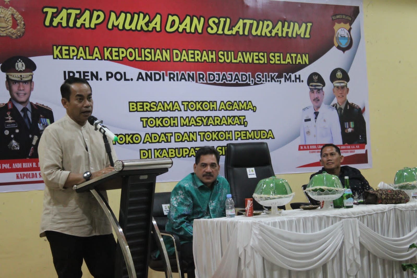 SIDRAP – Kapolda Sulsel Irjen Pol Andi Rian R.Djajadi, S.I.K.,M.H didampingi oleh PJU Polda Sulsel, Kapolres Sidrap AKBP Erwin Syah, S.I.K.M.H dan Pj.Bupati Sidrap Dr. Ns. H. Basrah, S.Kep.,M.Kes melaksanakan tatap muka dan silaturahmi dengan Tokoh Agama, Masyarakat, Adat dan Pemuda.