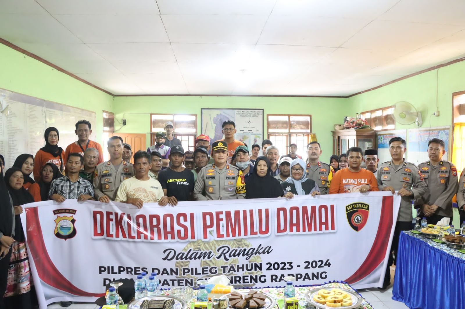 SIDRAP – Jelang pemilihan umum (Pemilu) tahun 2024, Kapolres Sidrap AKBP Erwin Syah,S.I.K.M.H bersama masyarakat melaksanakan Deklarasi Pemilu Damai di Aula Kantor Kelurahan Uluale, Kec Watang Pulu, Kab Sidrap.
