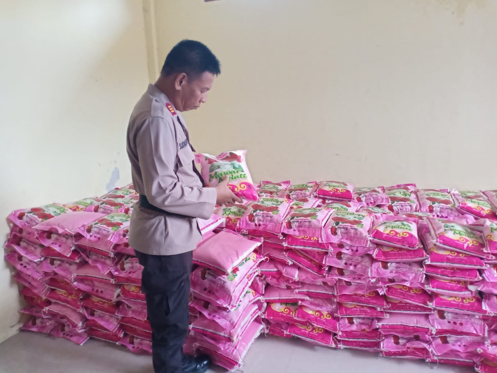 Beras yang dikemas dalam karung yang berisi 5kg tiap karungnya siap diberikan kepada warga, sebagai wujud Kepedulian terhadap sesama.