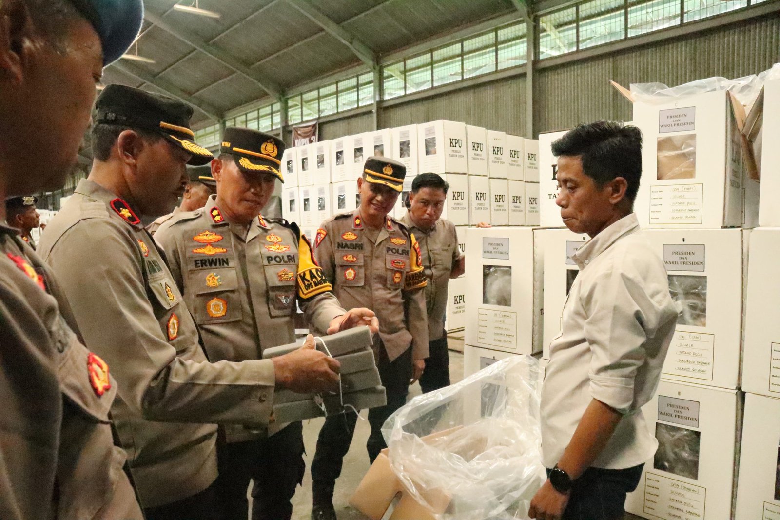 SIDRAP – 21 Hari jelang Pemilu, Kapolres Sidrap AKBP Erwin Syah, S.I.K.M.H melakukan pengecekan Logisitik Pemilu di Gudang Logistik KPU Sidrap di kawasan PT Sang Hyang Seri Persero Cabang Sidrap, Jalan Cokroaminoto, Kecamatan Maritengngae. Selasa (23/1/2024).