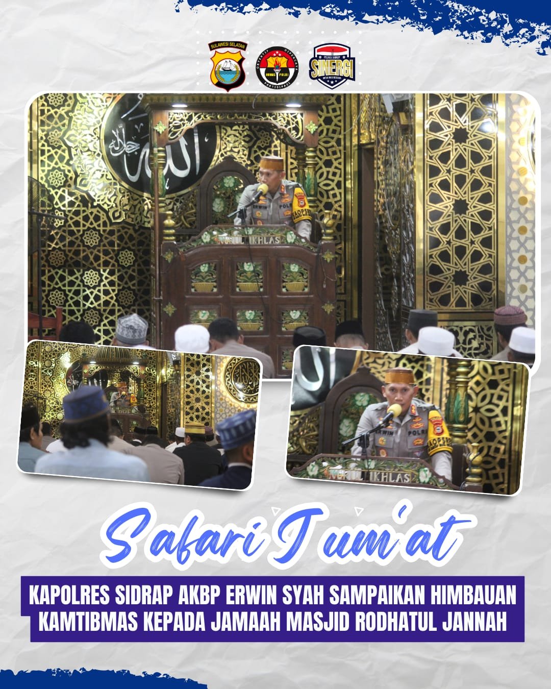 Usai sholat Jumat secara berjamaah, Kapolres Sidrap AKBP Erwin Syah mengucapkan terima kasih dan Apresiasi setinggi-tingginya kepada Jamaah Masjid atas kesempatan yang telah diberikan untuk memberikan pesan pesan Kamtibmas.