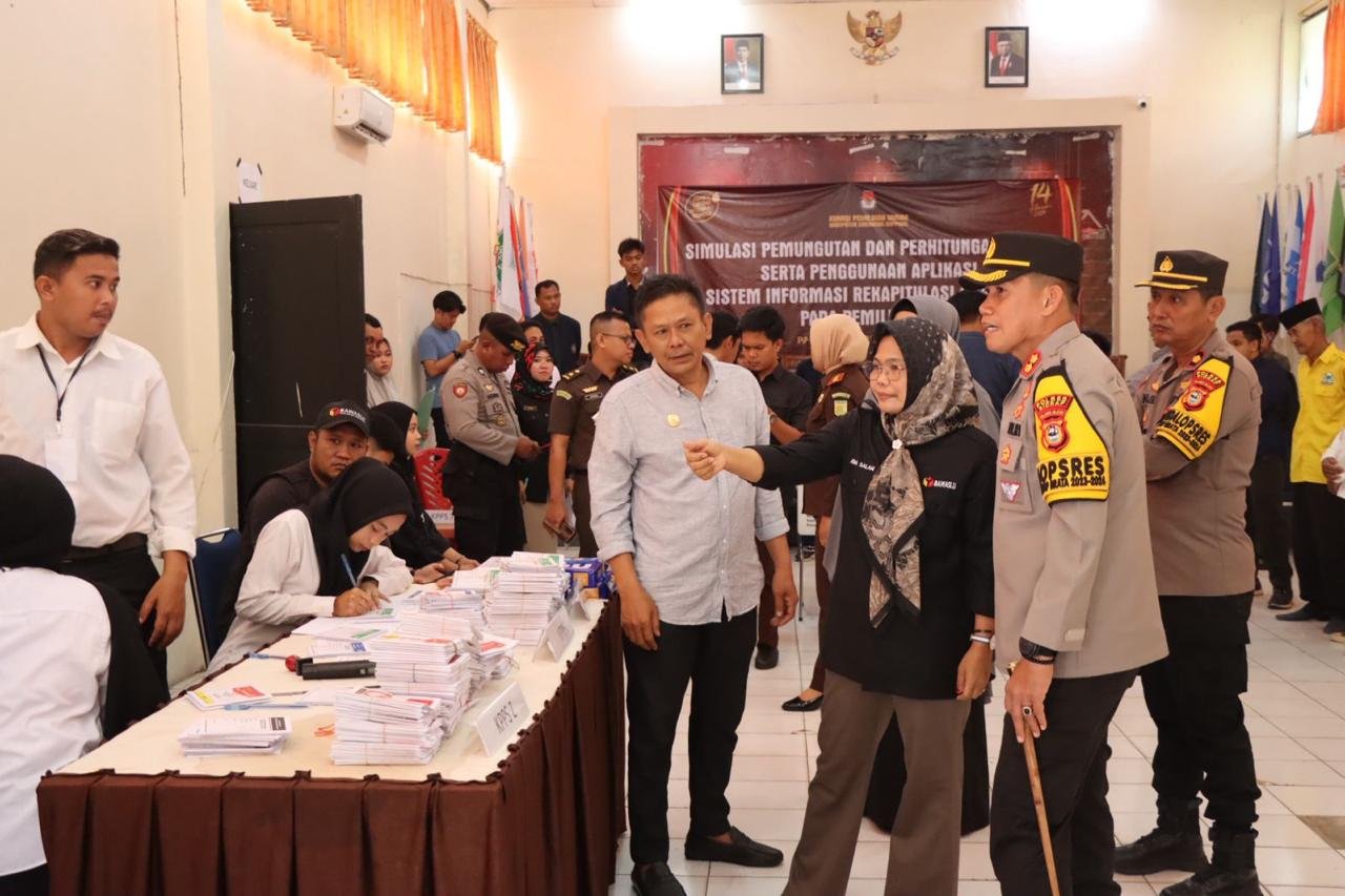 SIDRAP – Kapolres Sidrap AKBP Erwin Syah,S.I.K.,M.H didampingi oleh Para PJU hadiri simulasi Pemungutan dan Penghitungan Suara di Halaman Kantor KPU Sidrap, Jl. Ressang No.6, Kelurahan Pangkajene, Kec. Maritengngae.