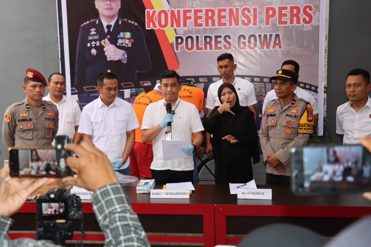 Kasat Narkoba Polres Gowa Iptu Syarifuddin, S.H., M.H didampingi Plt Kasi Humas Polres Gowa IPDA Udin Sibadu saat menggelar Press Release kasus tersebut menjelaskan, bahwa telah dilakukan penangkapan terhadap pelaku berinisial AS dan FR di dua lokasi berbeda setelah personel kami melakukan penyelidikan serta mendapatan informasi.