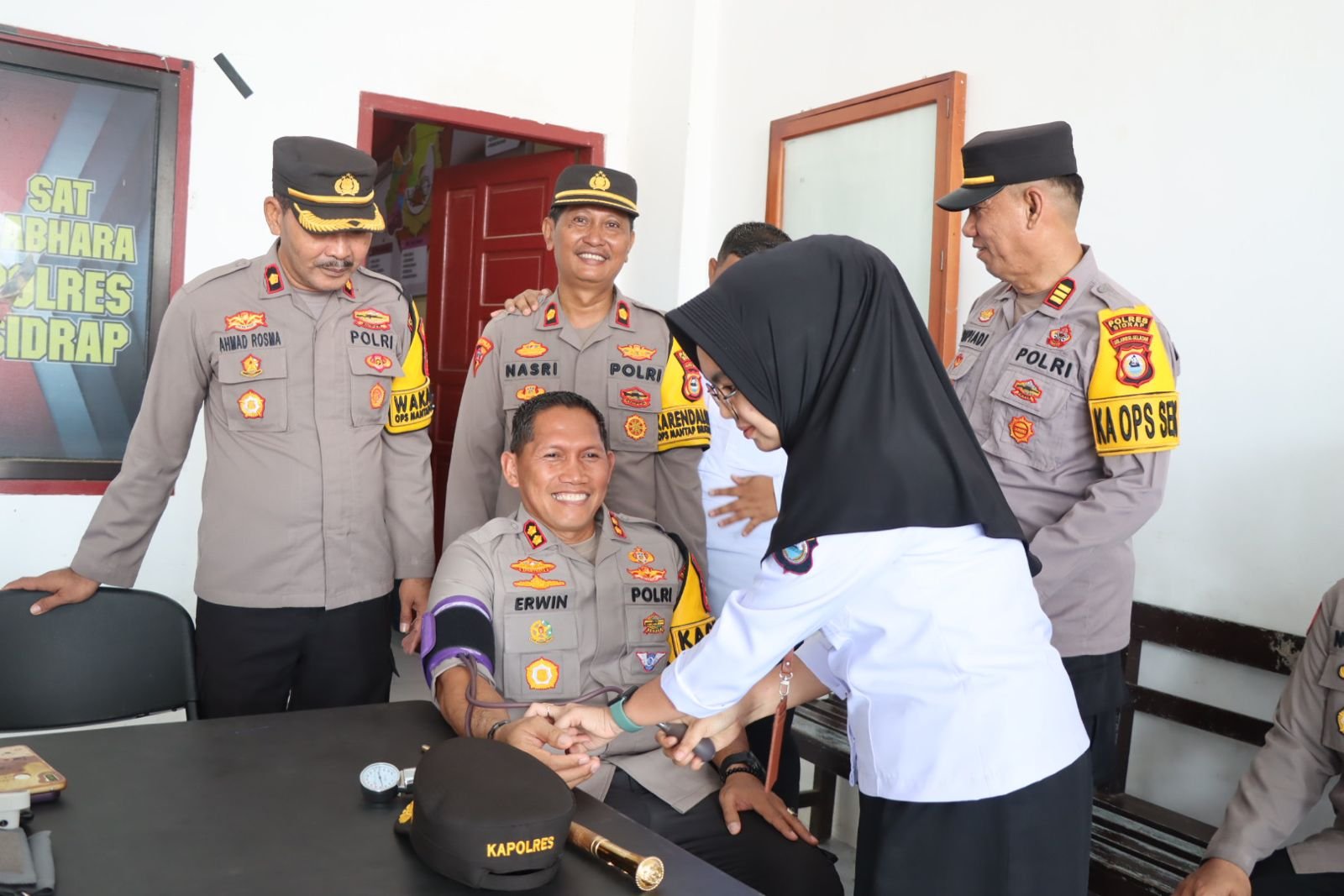 Pembarian vitamin dan Pemeriksaan Kesehatan (Rikkes) untuk personel di lakukan di Depan Ruangan Sat Samapta Polres Sidrap, Jalan Bau Massepe No.01, Kelurahan Pangkajene, Kecamatan Maritengngae. Senin (5/2/2024).