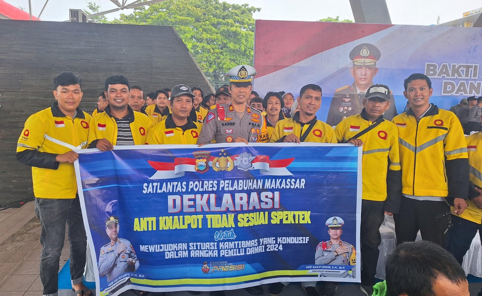 HUMDER – Satlantas Polres Pelabuhan Makassar menggelar deklarasi anti knalpot tidak sesuai spesifikasi teknis (knalpot brong atau racing) secara serentak di Lapangan Karebosi, Rabu (07/02/2024