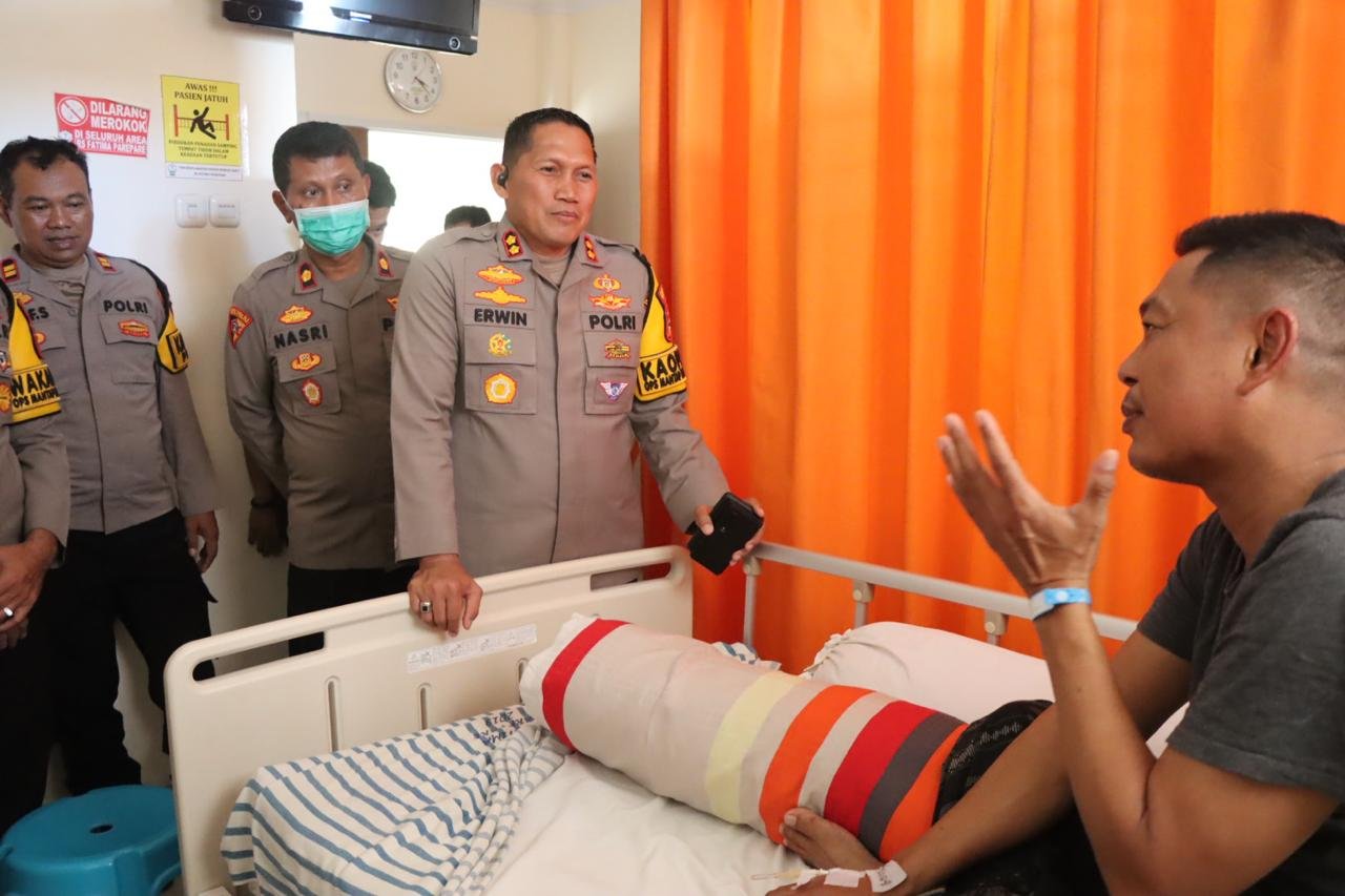 SIDRAP – Kapolres Sidrap AKBP Erwin Syah, S.I.K.M.H bersama Waka Polres Sidrap KOMPOL Ahmad Rosma dan Pejabat Utama membesuk Personelnya yang sementara di rawat di Rumah Sakit di Kota Parepare.