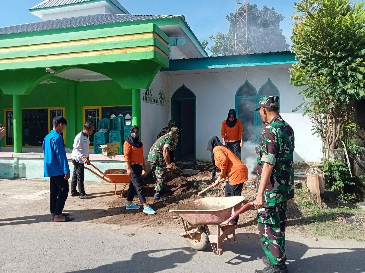 Dengan penuh kekompakan Babinsa bersama warga melaksanakan kegiatan karya bakti dengan mengedepankan kerjasama dan gotong royong untuk membersihkan lingkungan Masjid.
