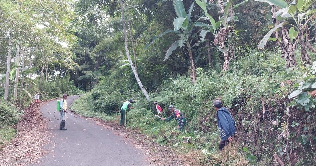 Bahu jalan yang telah di tutupi semak belukar dan rumput sehingga sehingga saluran air menjadi tertutup dan kurang enak dipandang. Hal ini membuat Sertu Abd. Azis bersama warga gotong-royong melaksanakan pembersihan saluran air dan bahu jalan.