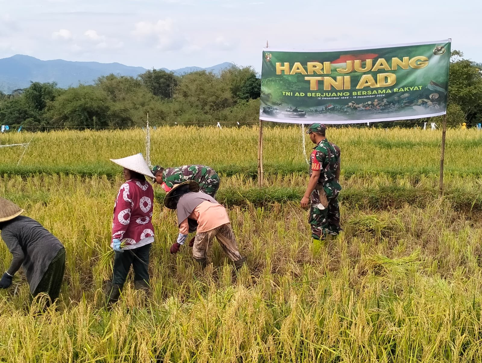 Gowa – Koramil 1409-04/Tinggimoncong melaksanakan panen raya padi dalam rangka memperingati Hari Juang TNI AD ke-79 untuk mendukung ketahanan pangan nasional tahun 2024. Panen raya padi ini dilaksanakan di lahan pertanian Kelompok Tani Sikapaccei di Lingk Parangbugis Kel.Buluttana Kec Tinggimoncong Kab. Gowa, Jumat (13/12/2024).