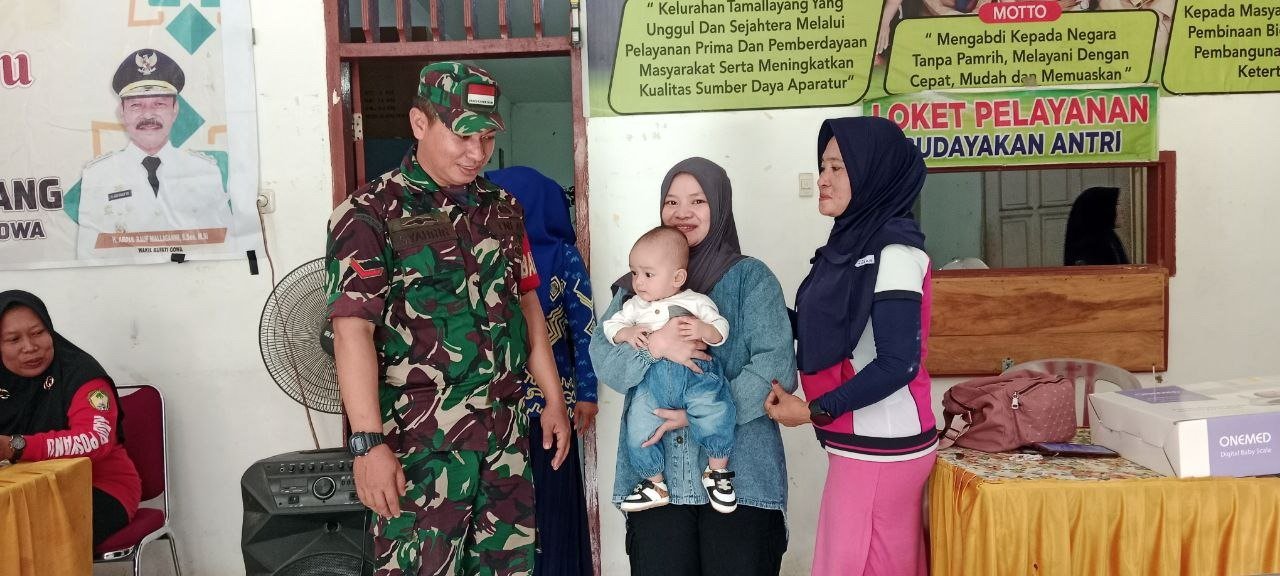 Gowa – Babinsa Koramil 1409-08/Bontonompo jajaran Kodim Kodim 1409/Gowa Kopda Syahrir melaksanakan pendampingan dalam kegiatan posyandu balita yang diselenggarakan oleh perangkat desa dan petugas kesehatan dalam rangka pemberian imunisasi dan makanan tambahan di kantor kelurahan Tamallayang kec Bontonompo kab. Gowa. Senin, (16/12/2024).
