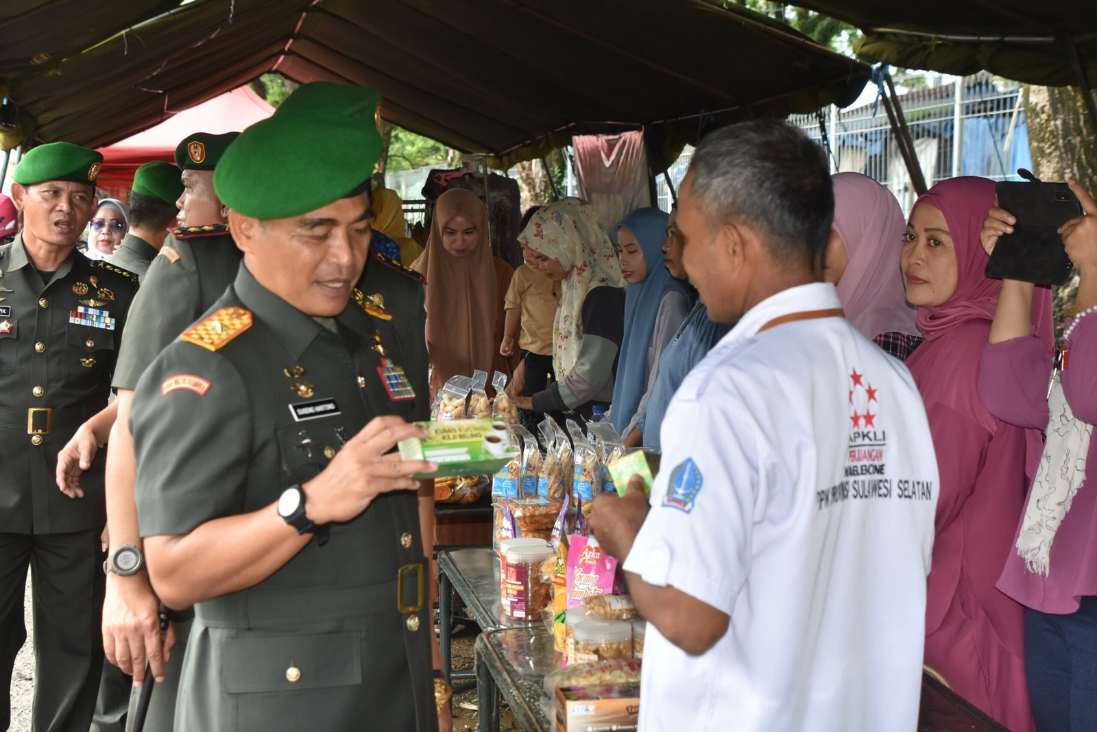 Watampone – Komandan Korem 141/Toddopuli Brigjen TNI Sugeng Hartono, S.E., M.M. meninjau kegiatan Bakti Sosial Bazar UMKM dan Bakti Kesehatan Gratis dalam rangka memperingati Hari Juang TNI-AD Tahun 2024 yang dilaksanakan oleh Kodim 1407/Bone bekerjasama dengan Denkesyah Bone bertempat di Lap. Tenis Indoor Kodim 1407/Bone Jln. Lapatau Kel. Manurunge dan depan kantor Tim Intelrem 141/Tp Jln. Kajaolaliddong Kel. Jeppee Kec. Tanete Riattang Barat Kab. Bone, Minggu (15/12/2024).
