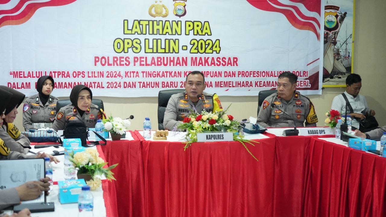 HUMDER — Dalam rangka mempersiapkan pengamanan Natal 2024 dan Tahun Baru 2025, Polres Pelabuhan Makassar menggelar kegiatan Latihan Pra Operasi (Lat Pra Ops) Lilin 2024. Dengan mengusung tema, “Melalui Latihan Pra Operasi Kita Tingkatkan Kemampuan dan Profesionalisme Polri dalam Pengamanan Natal 2024 dan Tahun Baru 2025, Guna Memelihara Keamanan Dalam Negeri,” kegiatan ini dipimpin langsung oleh Kapolres Pelabuhan Makassar, AKBP Restu Wijayanto.