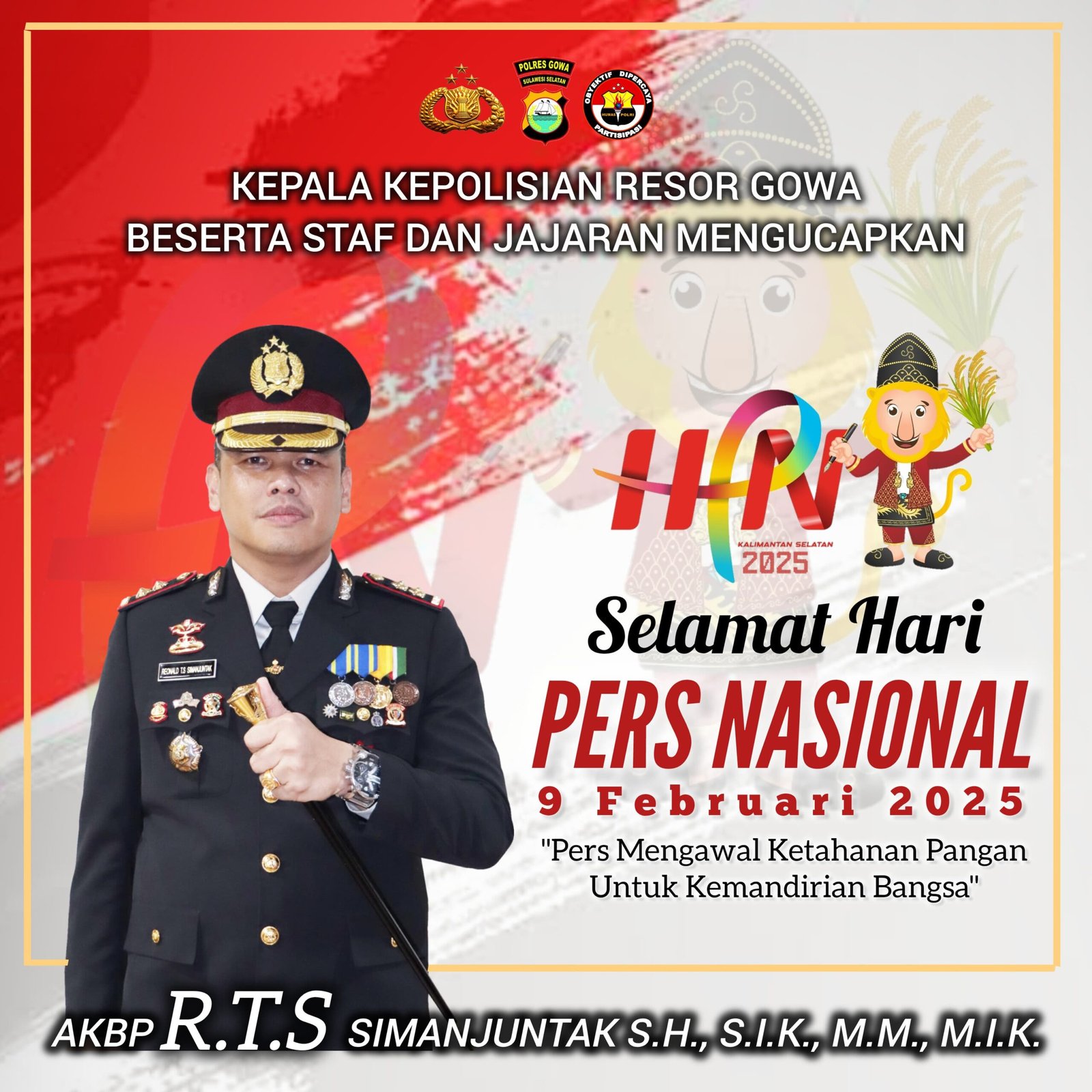 GOWA – Kapolres Gowa, AKBP R.T.S Simanjuntak, S.H., S.I.K., M.M., M.I.K., menyampaikan ucapan selamat memperingati Hari Pers Nasional (HPN) 2025, yang jatuh pada 9 Februari. Tahun ini, peringatan HPN mengusung tema “Pers Mengawal Ketahanan Pangan untuk Kemandirian Bangsa.”, Minggu (9/2/2025).