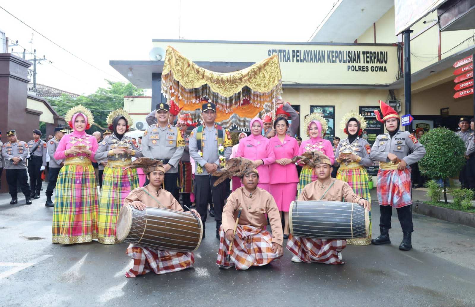 Kedatangan Kapolda Sulsel di Mapolres Gowa disambut dengan upacara adat yang diawali dengan Pengalungan Bunga oleh Kapolres Gowa, AKBP R.T.S Simanjuntak, S.H., S.I.K., M.M., M.I.K. Sementara itu, Ny. Yunita Yudhiawan menerima buket bunga dari Ketua Bhayangkari Cabang Gowa, Ny. Lidya Reonald Simanjuntak, dilanjutkan dengan Jajar Kehormatan yang dilakukan oleh personel Polres Gowa.