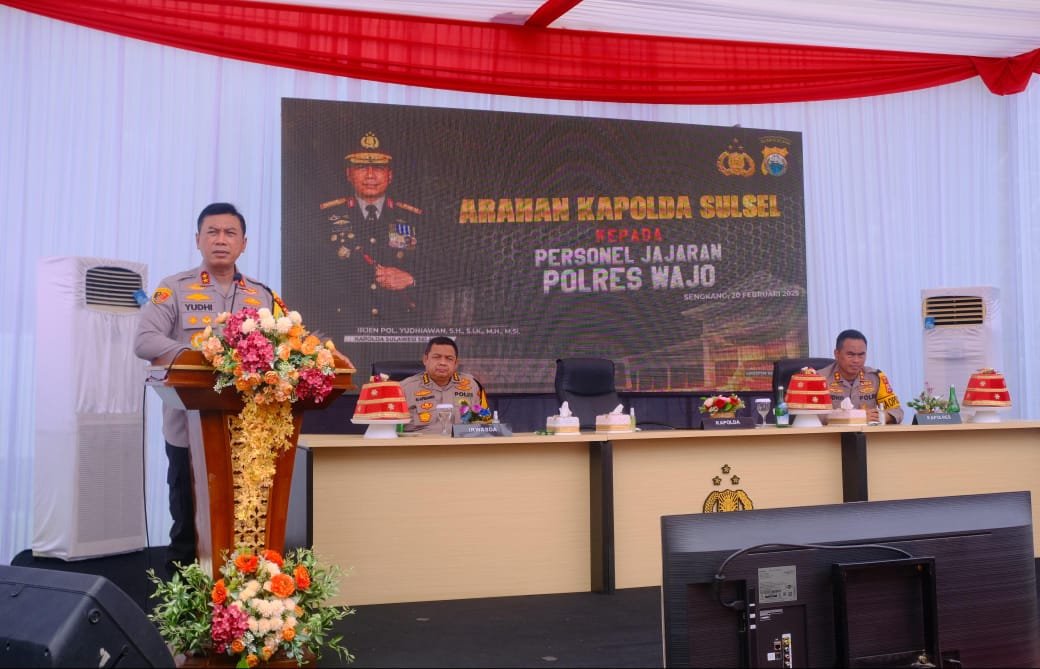 Cybernews86 – Kapolda Sulawesi Selatan, Irjen Pol. Yudhiawan S.H., S.I.K., M.H., M.Si., didampingi Ketua Bhayangkari Daerah Sulsel, Ny. Yunita Yudhiawan, melaksanakan kunjungan kerja ke Polres Wajo pada Kamis (20/02/25).