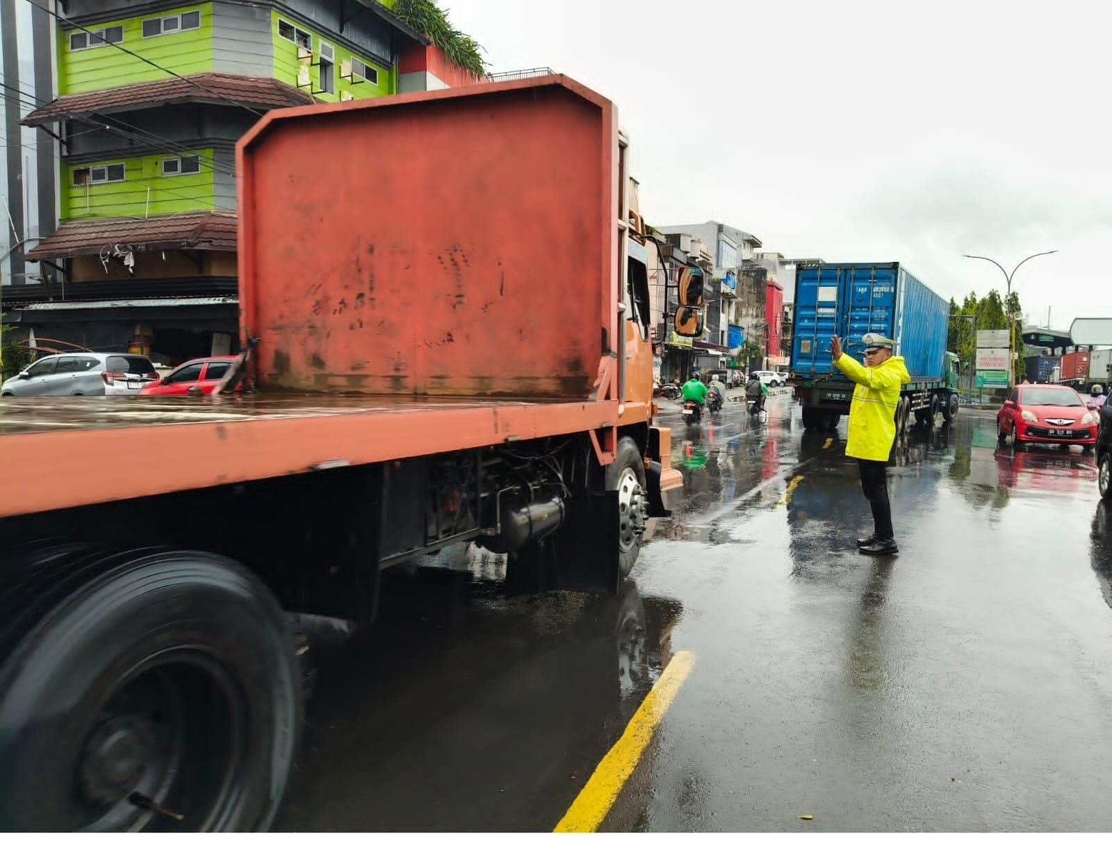 Personel kepolisian terlihat aktif mengatur arus lalu lintas, memberikan isyarat kepada pengendara untuk berhati-hati, serta mengingatkan mereka agar mengurangi kecepatan demi keselamatan bersama. Jalanan yang licin dan tergenang air menjadi perhatian utama petugas dalam memastikan kelancaran lalu lintas.
