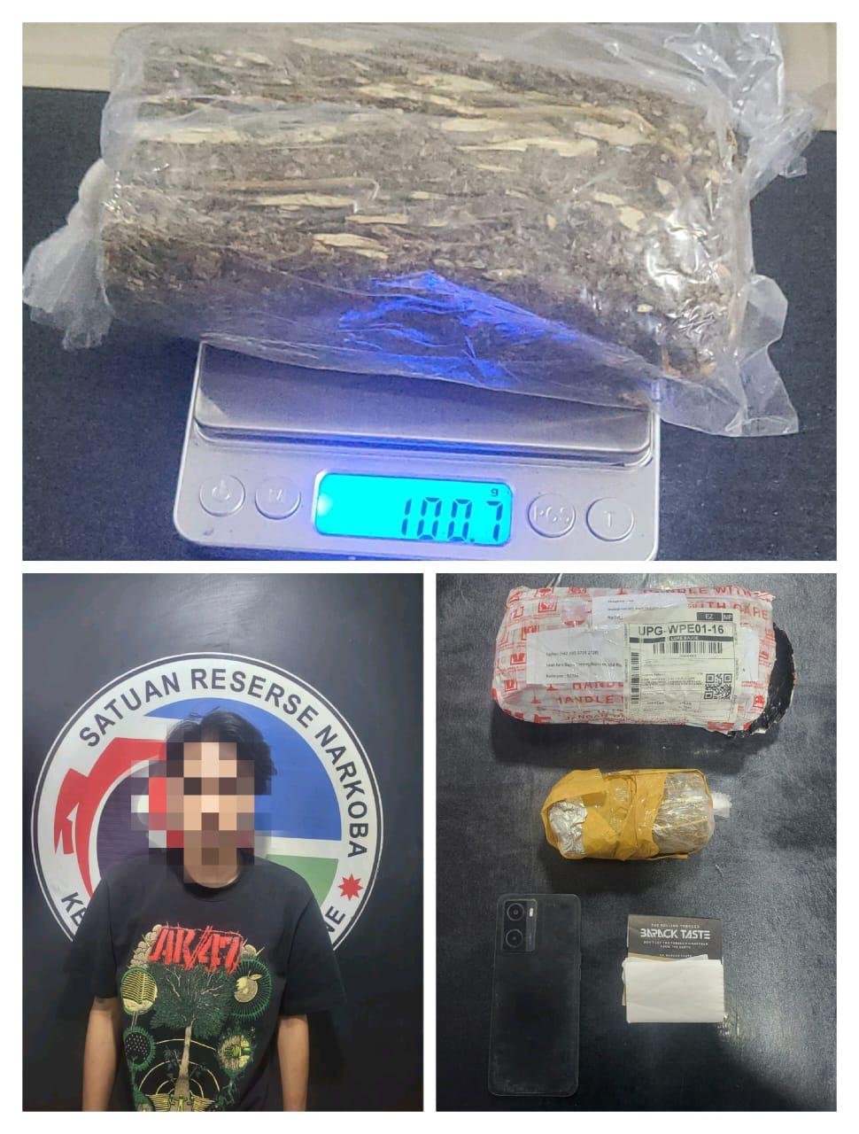 Lebih lanjut, Kasat Narkoba mengatakan bahwa, pada saat dilakukan penggeledahan terhadap pelaku, ditemukan 1 buah paket diduga tanaman ganja yang tersimpan dalam plastik packingan Paket yang baru saja diterima dari kurir JNT dan 1 set kertas lintingan ganja.