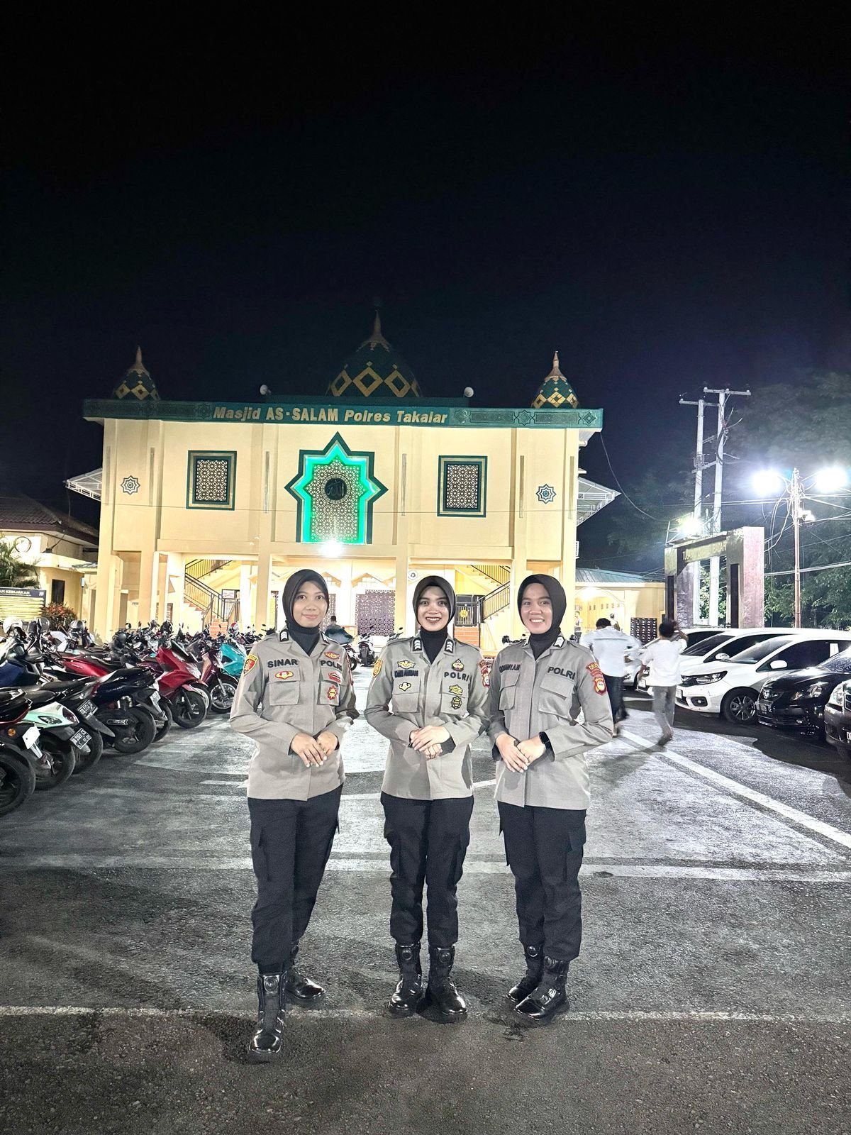 Takalar – Sulsel, Sejumlah Polisi Wanita (Polwan) Polres Takalar dikerahkan untuk mengamankan jalannya salat tarawih di Masjid As-Salam Di Kel Kalabbirang Kab Takalar, Rabu (6/3/25). Kehadiran mereka bertujuan untuk memastikan keamanan dan kenyamanan jamaah selama beribadah di bulan suci Ramadan.