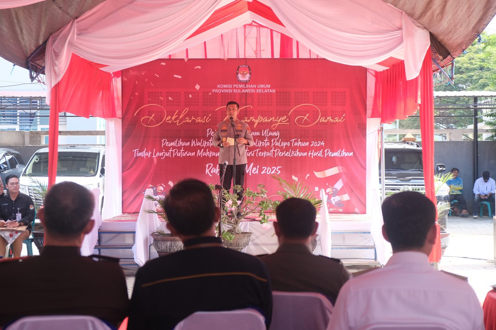 Cybernews86 – Kepala Kepolisian Daerah (Kapolda) Sulawesi Selatan, Irjen Pol. Drs. Rusdi Hartono, M.Si., menghadiri dan memberikan arahan dalam acara Deklarasi Kampanye Damai menjelang pelaksanaan Pemungutan Suara Ulang (PSU) Pemilihan Wali Kota dan Wakil Wali Kota Palopo Tahun 2024. Kegiatan ini berlangsung di Kantor Komisi Pemilihan Umum (KPU) Kota Palopo pada Rabu (07/05/2025).