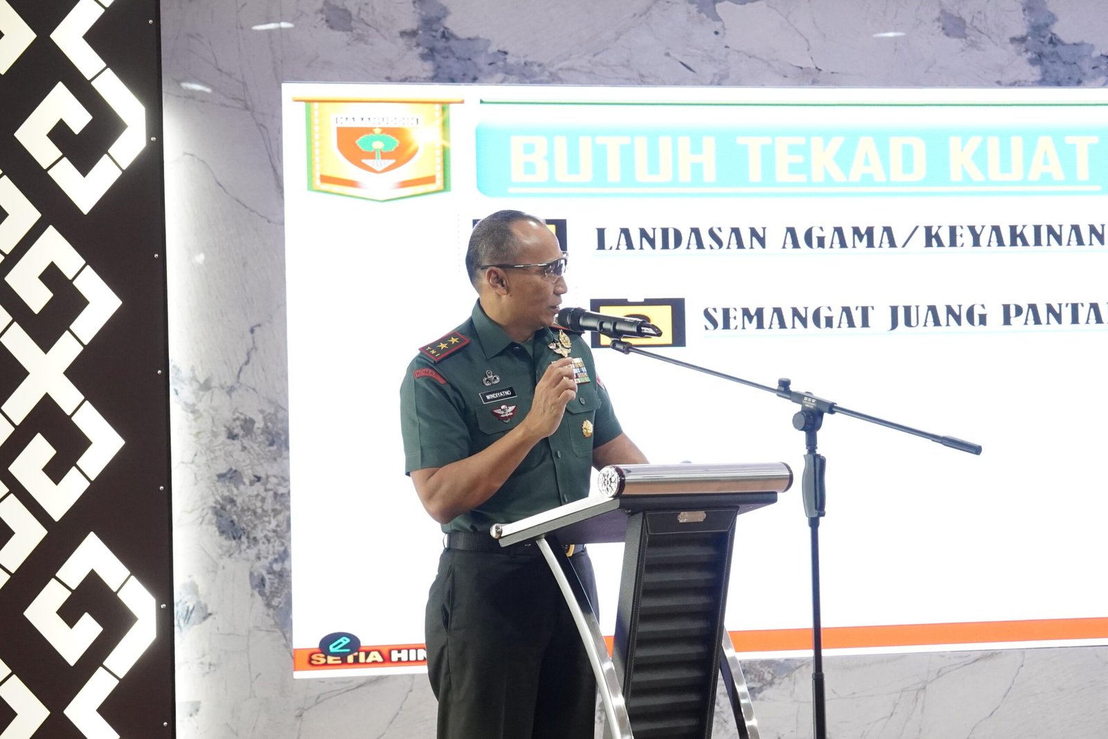 Pembekalan yang diberikan oleh Pangdam ini dalam rangka mendukung pencapaian target penerimaan pajak tahun 2025 ini yang mengangkat tema “Memperkuat Jiwa Militansi Dalam Pelaksanaan Tugas”. Dalam paparannya, Mayjen Windiyatno menekankan pentingnya nilai-nilai Pancasila, integritas, disiplin, loyalitas, serta semangat pantang menyerah dalam menjalankan tugas, khususnya dalam menghadapi tantangan penerimaan negara dari sektor perpajakan.