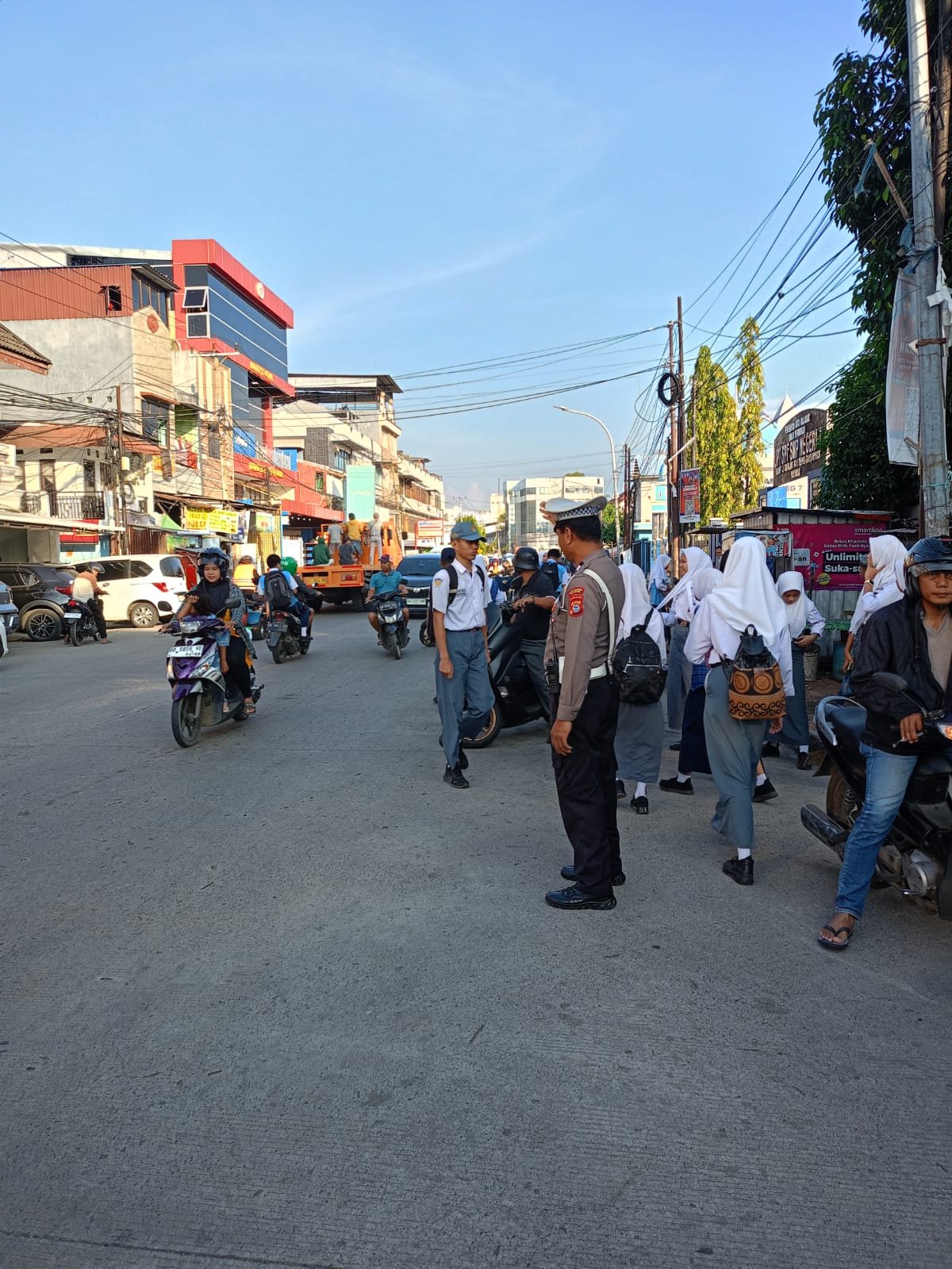 “Kalau tidak ada polisi, biasanya macet dan takut anak-anak tidak kelihatan waktu menyeberang. Sekarang lebih aman,” kata Warga