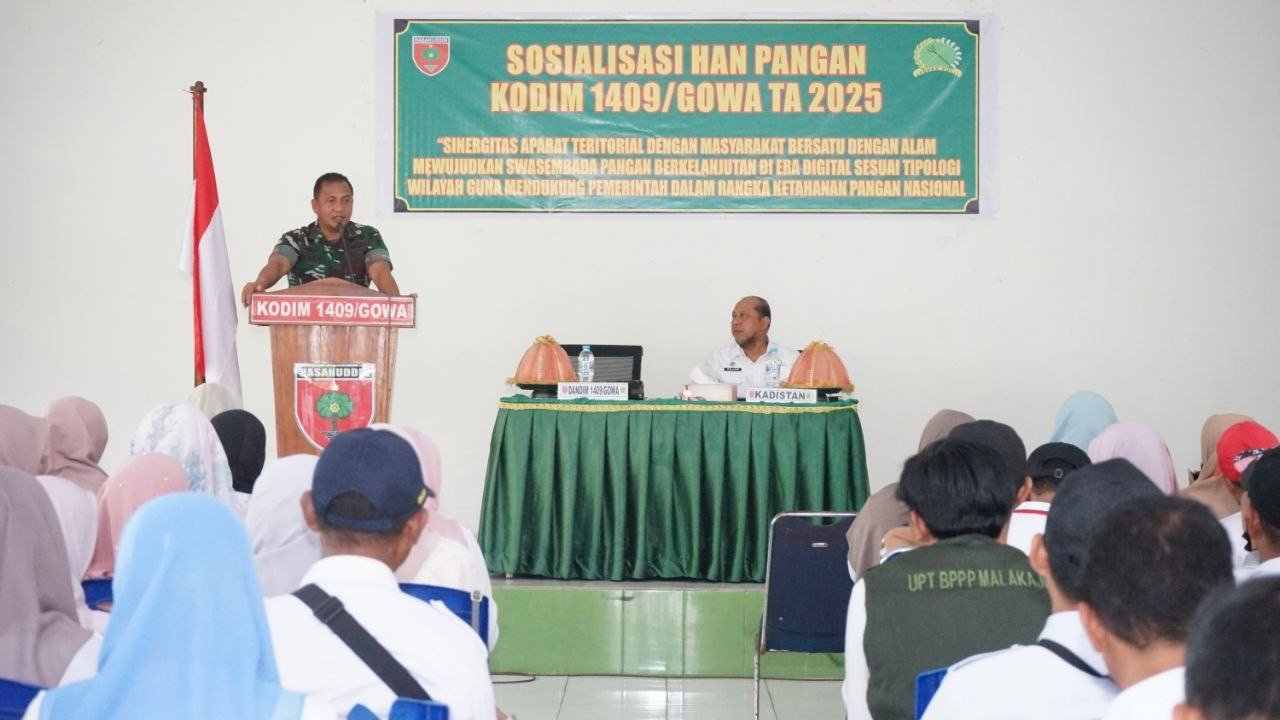 GOWA – Komando Distrik Militer (Kodim) 1409/Gowa menggelar kegiatan Sosialisasi Ketahanan Pangan Tahun Anggaran 2025 yang berlangsung di Aula Makodim 1409/Gowa, Jl. Sultan Hasanuddin, Kelurahan Pandang-pandang, Kecamatan Somba Opu, Kabupaten Gowa. Kegiatan ini mengangkat tema “Sinergitas aparat teritorial dengan masyarakat bersatu dengan alam mewujudkan swasembada pangan berkelanjutan di era digital sesuai tipologi wilayah guna mendukung pemerintah dalam rangka ketahanan pangan.” Rabu, 25/6/2025