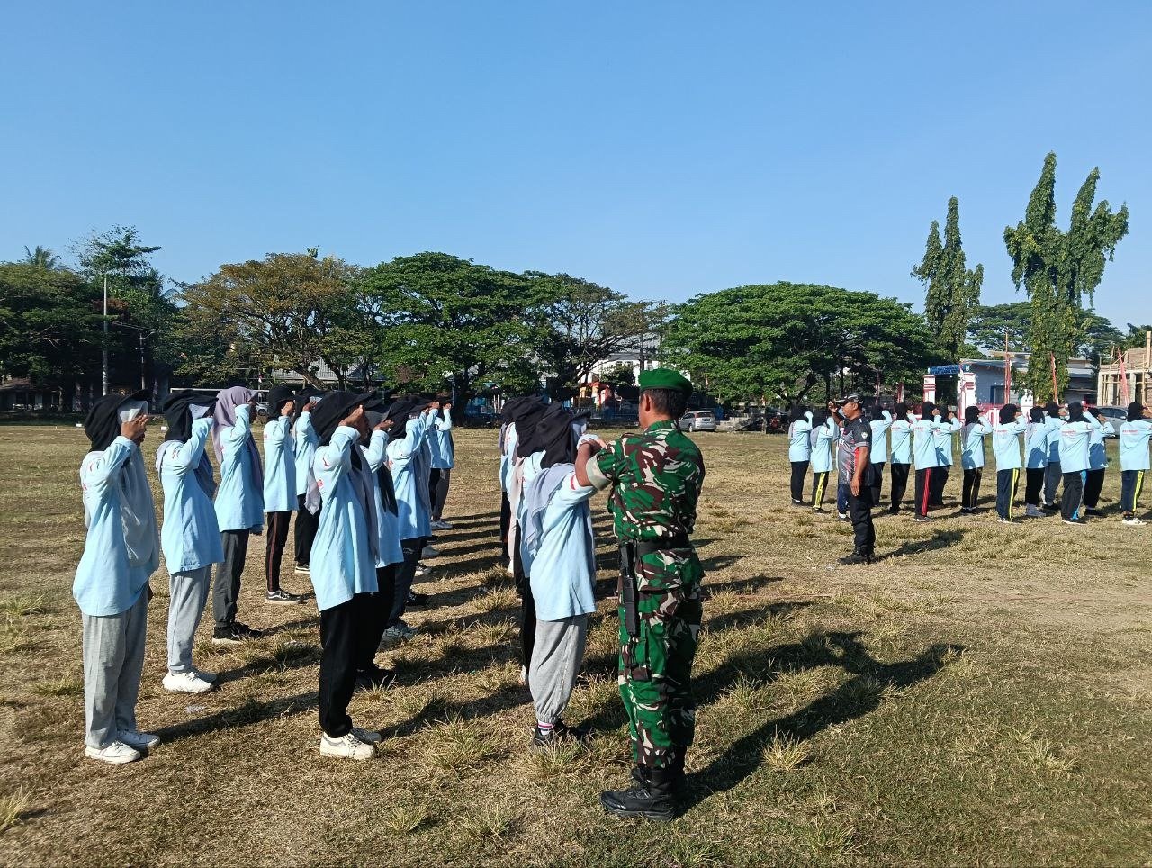 Gowa – Bertempat di Lapangan Bontocaradde, Lingkungan Tamallayeng, Kelurahan Tamallayeng, Kecamatan Bontonompo, Serka Mustika Babinsa Koramil 1409-08/Bontonompo bersama dua personel Polsek Bontonompo, Aiptu Suaib dan Bripka Bakri, melaksanakan pelatihan calon Pasukan Pengibar Bendera Pusaka (Paskibraka) tingkat kecamatan. Kamis, (14/8/2025).