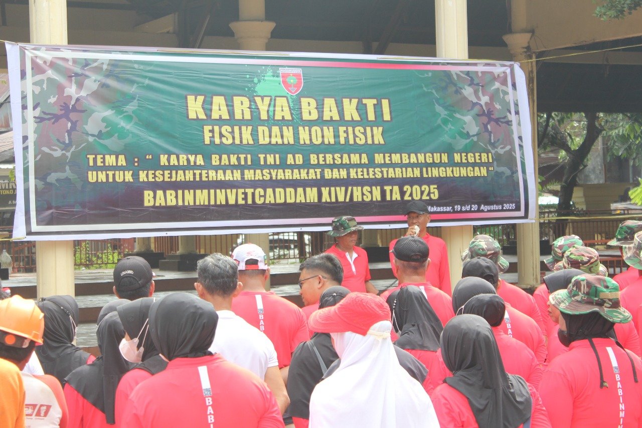 Makassar โ€“ Badan Pembinaan Administrasi Veteran dan Cadangan (Babinminvetcaddam) XIV/Hasanuddin menggelar Karya Bakti dalam rangka memperingati HUT ke-80 Kemerdekaan Republik Indonesia Tahun 2025, yang dipimpin langsung oleh Kababinminvetcaddam XIV/Hasanuddin Letkol Inf Sandhi Yudho Panoto, S.E., M.Han., bertempat di Monumen 40.000 Jiwa, Jl. Korban 40.000 Jiwa, Kel. Laโ€™latang, Kec. Tallo, Kota Makassar, Rabu (20/8/2025).