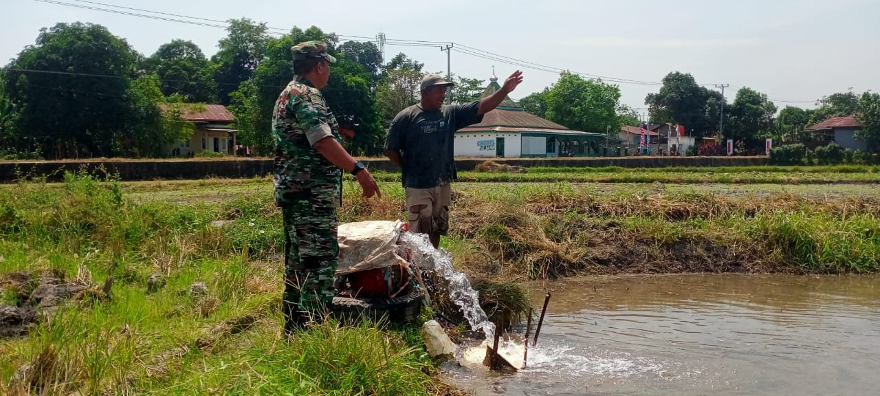 Serka Abbasruddin bersama Ketua Kelompok Tani Timborang, Bapak Abbas Dg Tola, memantau pengairan sawah seluas 17 are milik Bapak Hadrawih. Lahan tersebut ditanami padi jenis Mekongga yang saat ini sedang dalam fase pemeliharaan penting, yaitu pengisian air menggunakan pompa sumur bor.