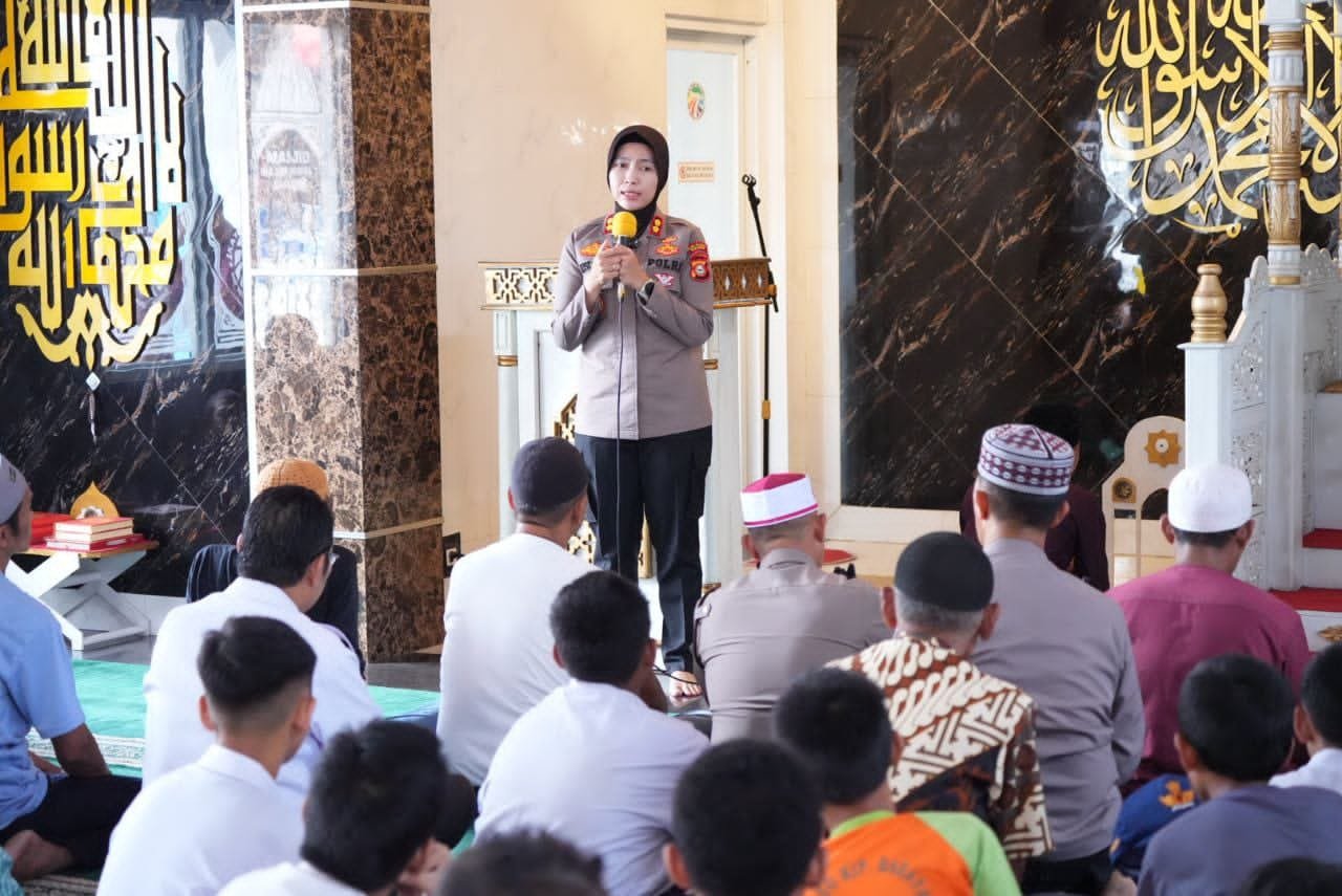 HUMDER — Suasana penuh kehangatan dan kekhidmatan terasa di Masjid IKA SMP 7 Makassar, Jl. Cakalang, ketika Kapolres Pelabuhan Makassar AKBP Rise Sandiyantanti memimpin kegiatan Safari Memakmurkan Masjid dengan shalat Dzuhur berjamaah