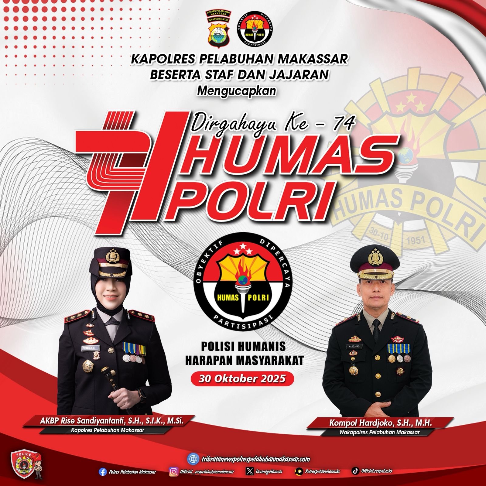 HUMDER — Kapolres Pelabuhan Makassar AKBP Rise Sandiyantanti menyampaikan ucapan selamat Dirgahayu ke-74 Humas Polri, yang diperingati pada 30 Oktober 2025. Peringatan tahun ini mengusung tema “Polisi Humanis, Harapan Masyarakat,” yang menjadi momentum penting bagi seluruh jajaran Humas Polri untuk terus memperkuat perannya sebagai jembatan komunikasi antara Polri dan masyarakat.