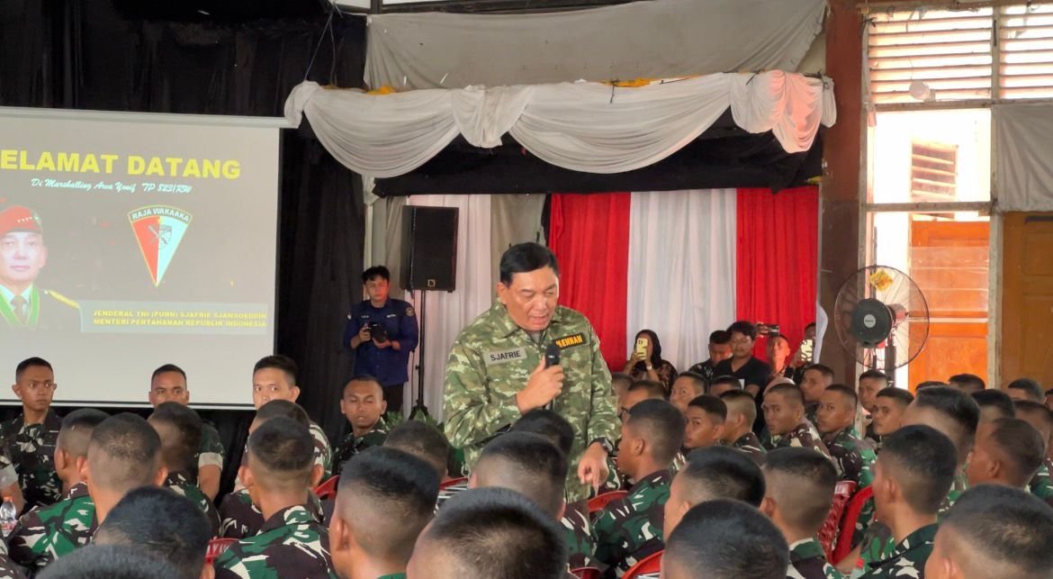 Bau-Bau โ Pangdam XIV/Hasanuddin Mayjen TNI Bangun Nawoko menyambut sekaligus mendampingi Menteri Pertahanan Republik Indonesia, Jenderal TNI (Purn) Sjafrie Sjamsoeddin bersama rombongan, dalam kunjungan kerjanya meninjau Marshaling Area Batalyon Infanteri Teritorial Pembangunan (Yonif TP) 823/Raja Wakaaka di Kelurahan Wangkanapi, Kec. Wolio, Kota Bau-Bau. Selasa, (4/11/2025).