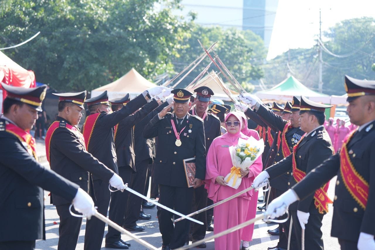 Momen kemudian berlanjut pada tradisi pedang pora, sebuah prosesi sakral dalam budaya kepolisian yang menandai berakhirnya masa pengabdian seorang personel. AKP Nasrullah dan Aiptu Rasyid melangkah melewati barisan pedang pora dengan wajah bangga dan mata yang berkaca-kaca, diiringi tepuk tangan hangat seluruh jajaran.