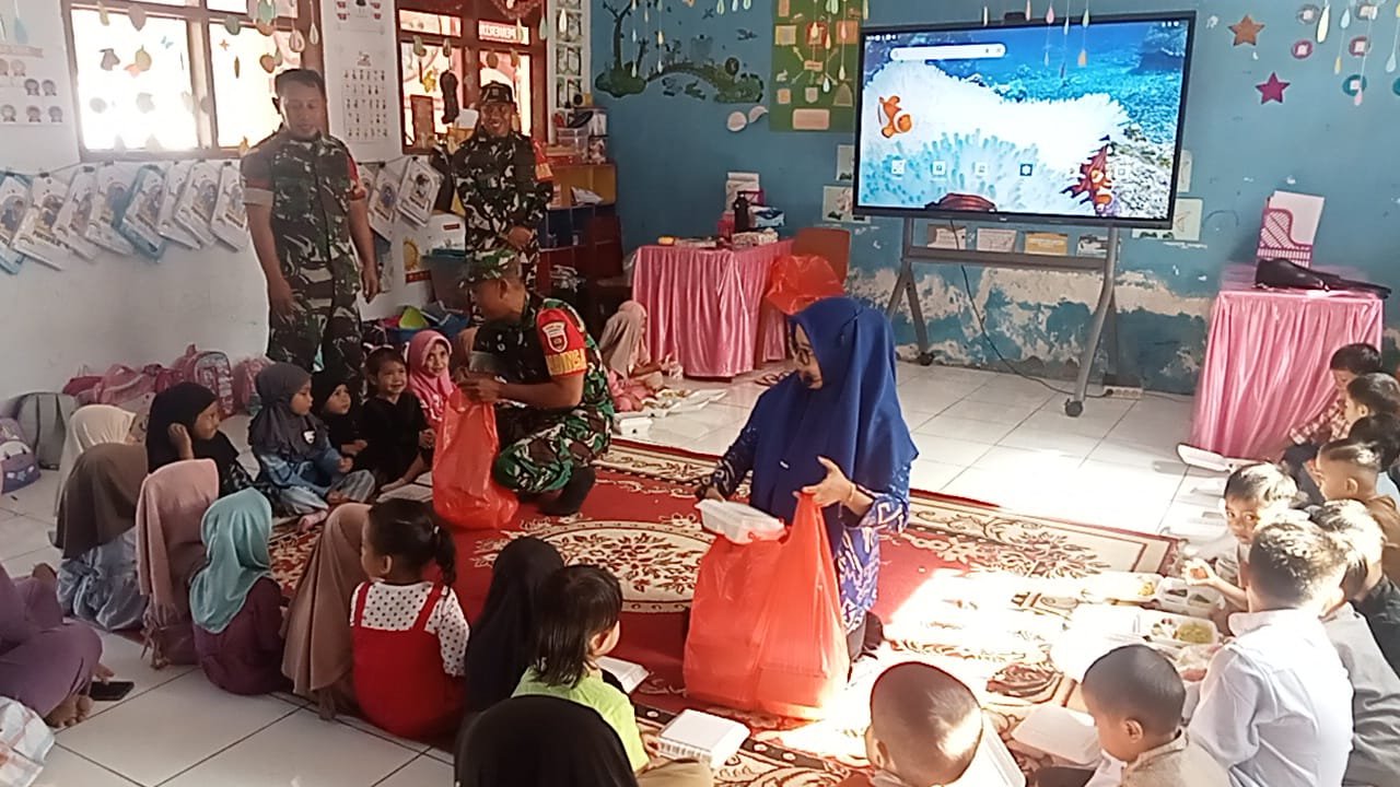 Sertu Risal, Babinsa Koramil 1409-07/Tompobulu, bersama dua orang Babinsa lainnya, hadir langsung untuk menyalurkan makanan bergizi kepada 29 siswa/i TK tersebut.