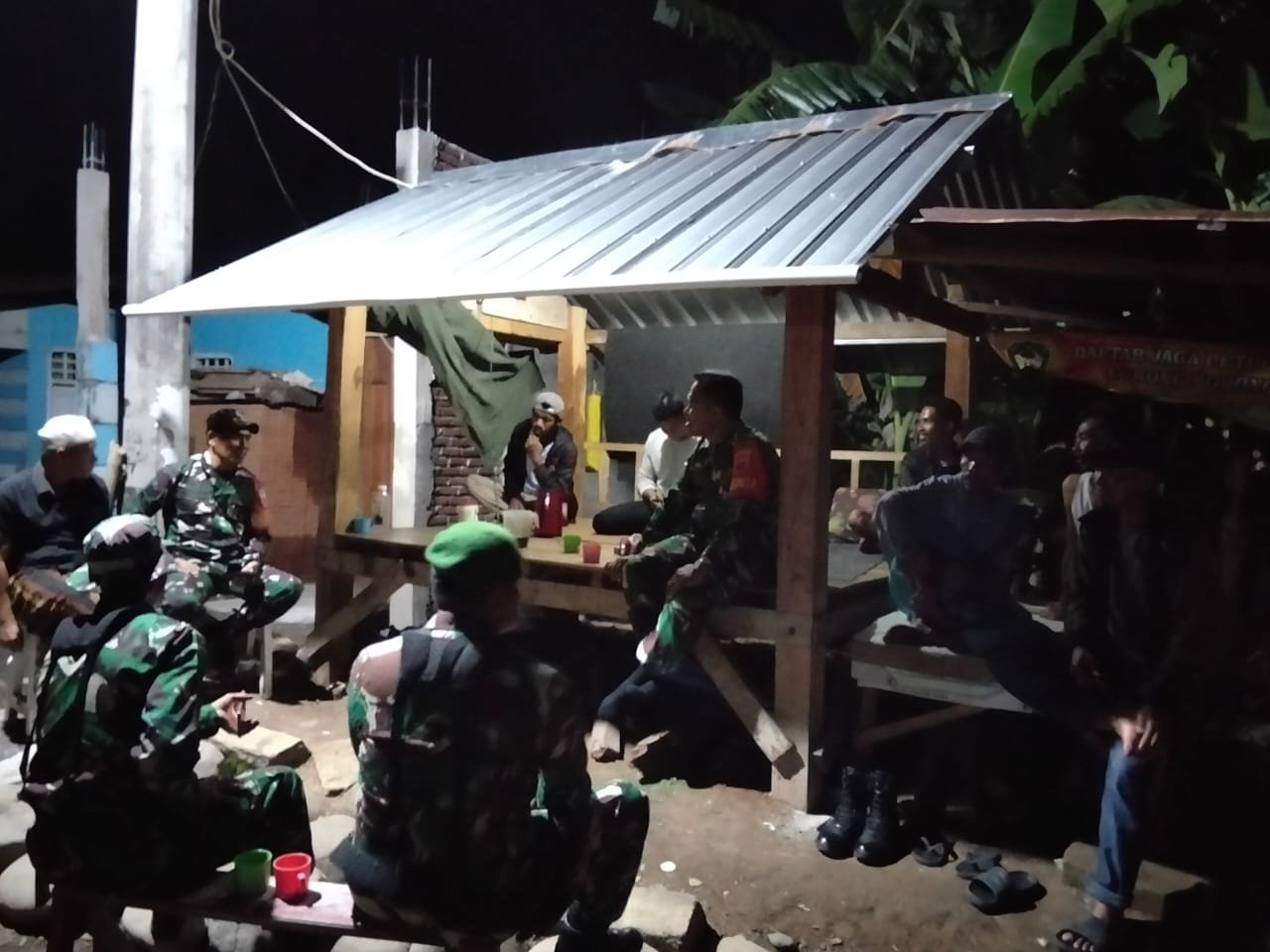 โDi lokasi Pos Kamling, petugas menyempatkan diri berdialog dengan warga yang sedang berjaga. Kehadiran personel TNI dan perangkat desa ini mendapat apresiasi positif dari warga, karena dianggap efektif menekan potensi tindak kriminalitas serta mempererat tali silaturahmi antara aparat dan masyarakat.