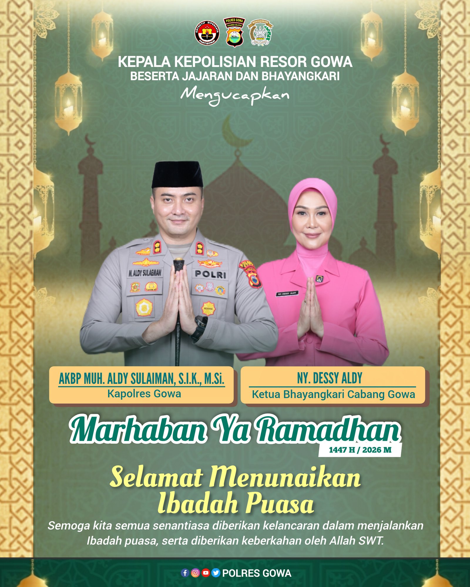 โ€œAtas nama pribadi, keluarga besar Polres Gowa dan Bhayangkari, kami mengucapkan “Marhaban Ya Ramadhan” 1447 H/2026 M. Selamat menunaikan ibadah puasa. Semoga Allah SWT senantiasa melimpahkan rahmat, ampunan dan keberkahan-Nya kepada kita semua,โ€ ujar AKBP Muh. Aldy Sulaiman.