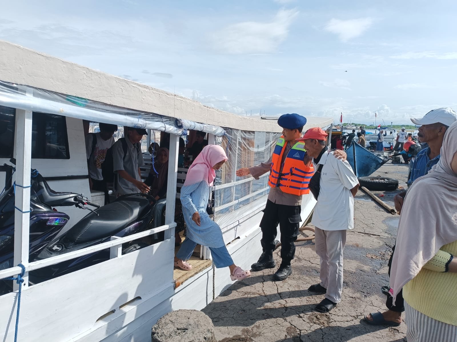 Dalam patroli tersebut, personel Satpolairud menyapa penumpang kapal tradisional sembari menyampaikan imbauan keselamatan berlayar. Tak jarang, petugas terlihat membantu lansia dan anak-anak saat turun dari kapal, memastikan mereka melangkah dengan aman di dermaga.