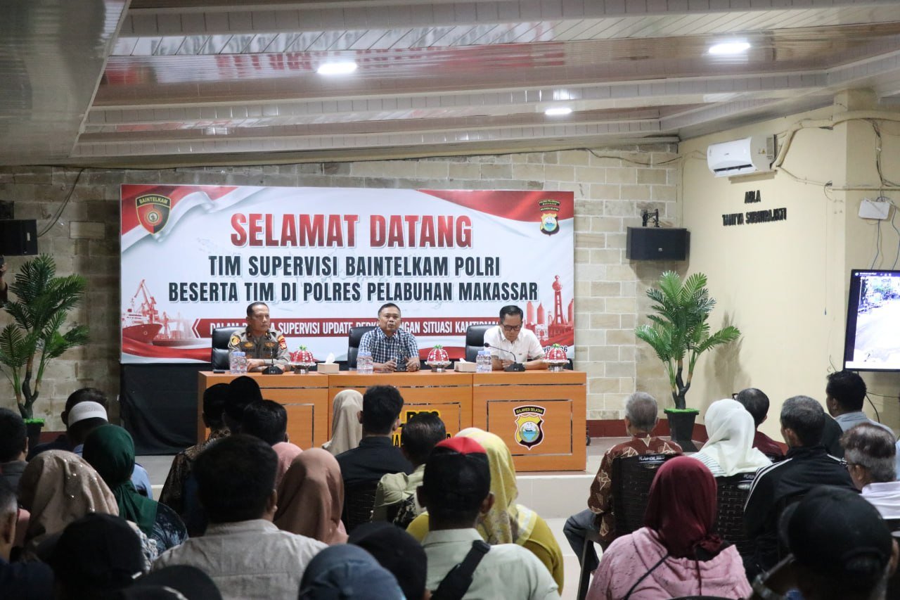 MAKASSAR โ Tim Supervisi BIK Mabes Polri melaksanakan kunjungan silaturahmi ke Mako Polres Pelabuhan Makassar dalam rangka memperkuat sinergi menjaga keamanan dan ketertiban masyarakat (Kamtibmas), Kamis (23/4/2026).