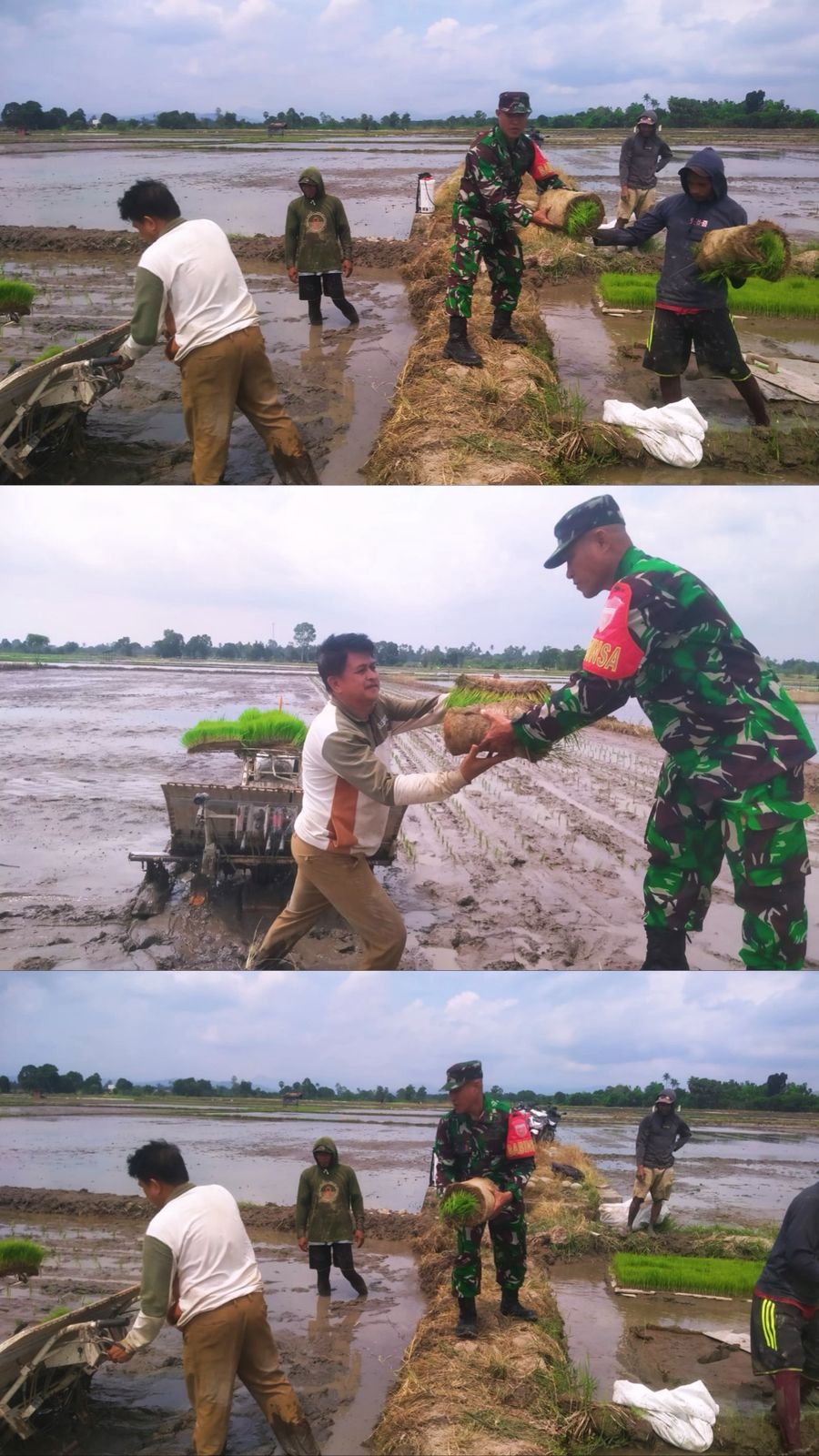 Hadir langsung di tengah persawahan, Pelda Suhardi bersama Ketua Poktan, Dg. Tompo, memberikan motivasi serta bantuan teknis guna memastikan proses penanaman berjalan efektif dan serentak.